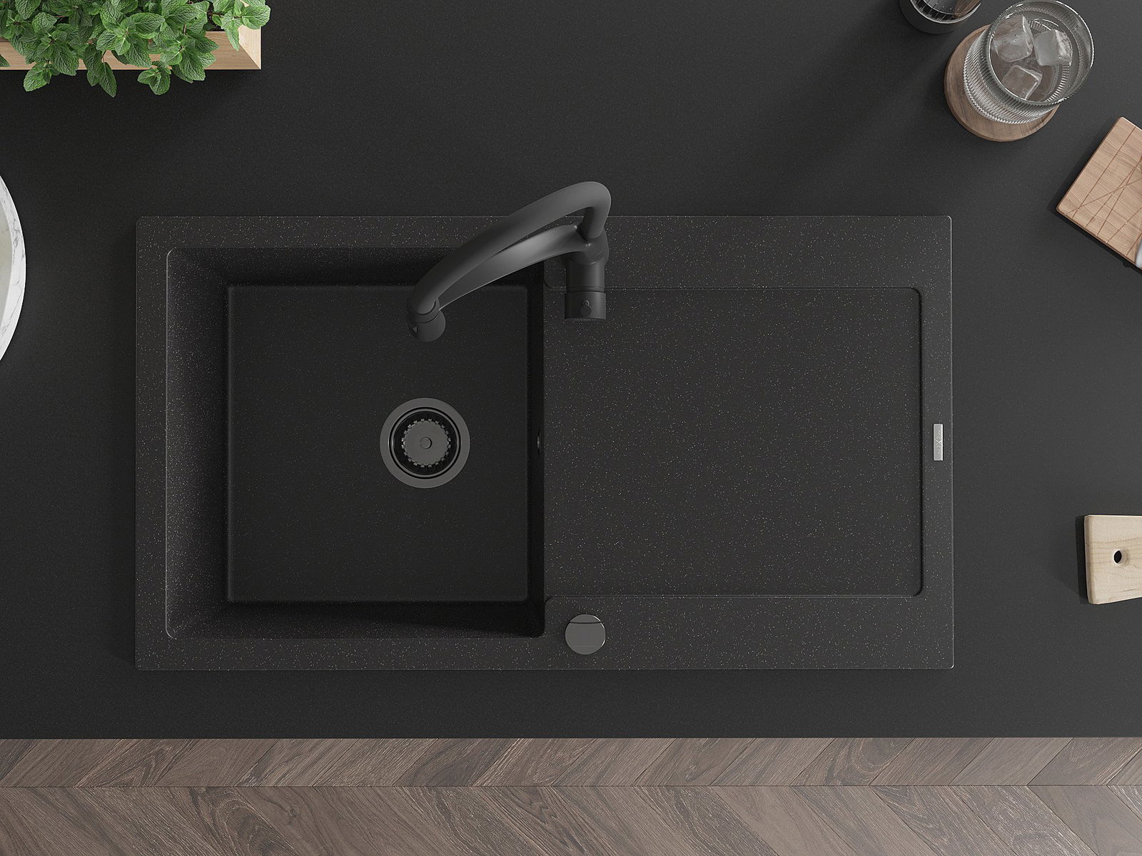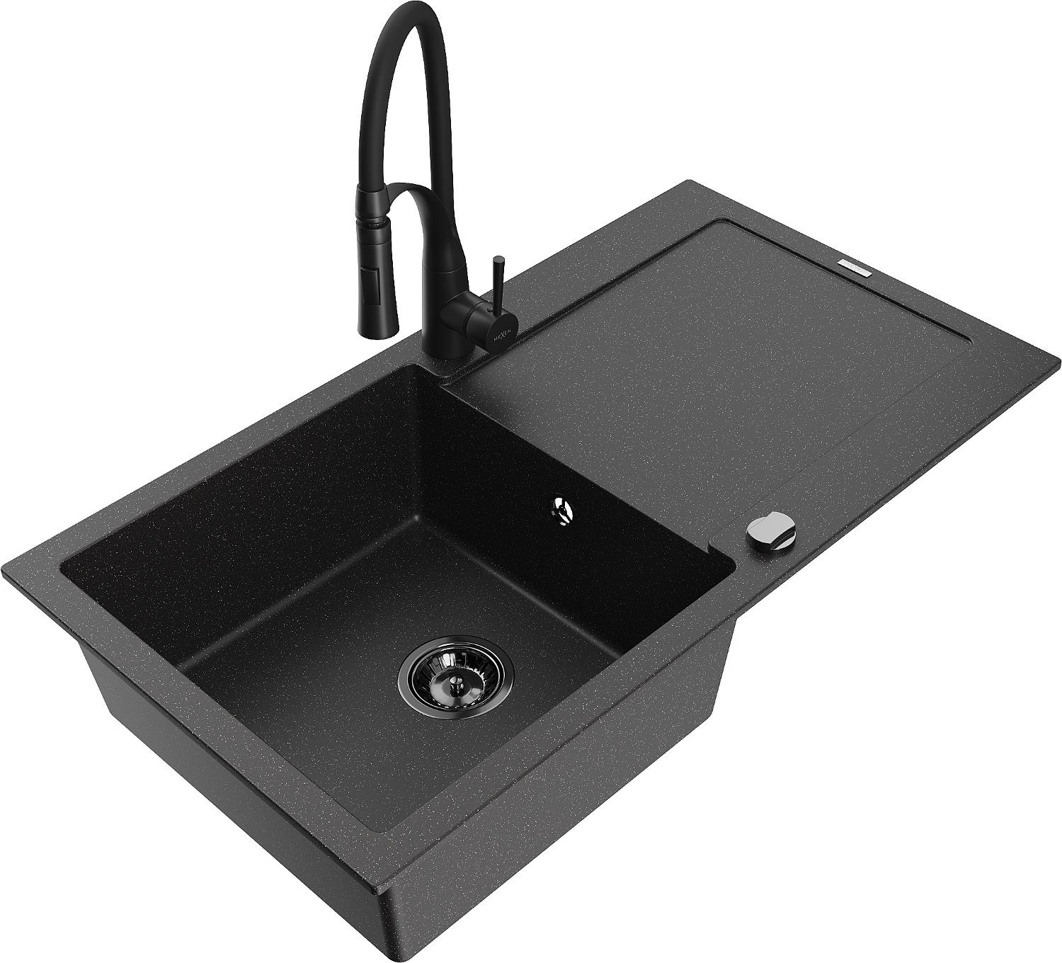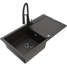 Mexen Leo granitinė vienos kameros plautuvė su nusausinimo vieta ir virtuvės maišytuvu Aster, juoda/sidabrinė metalo spalva