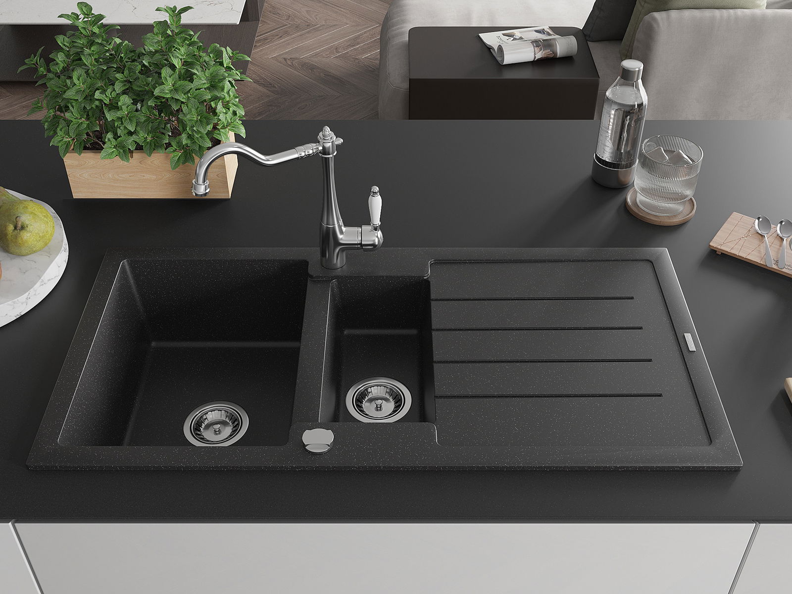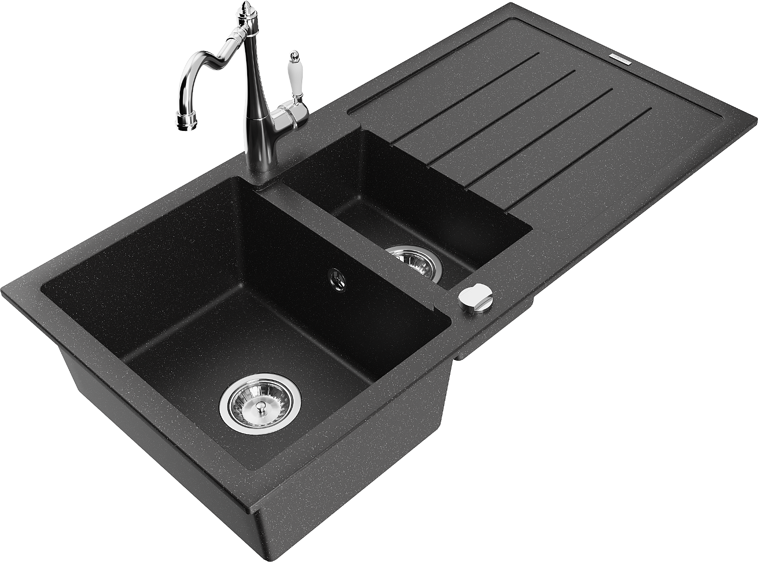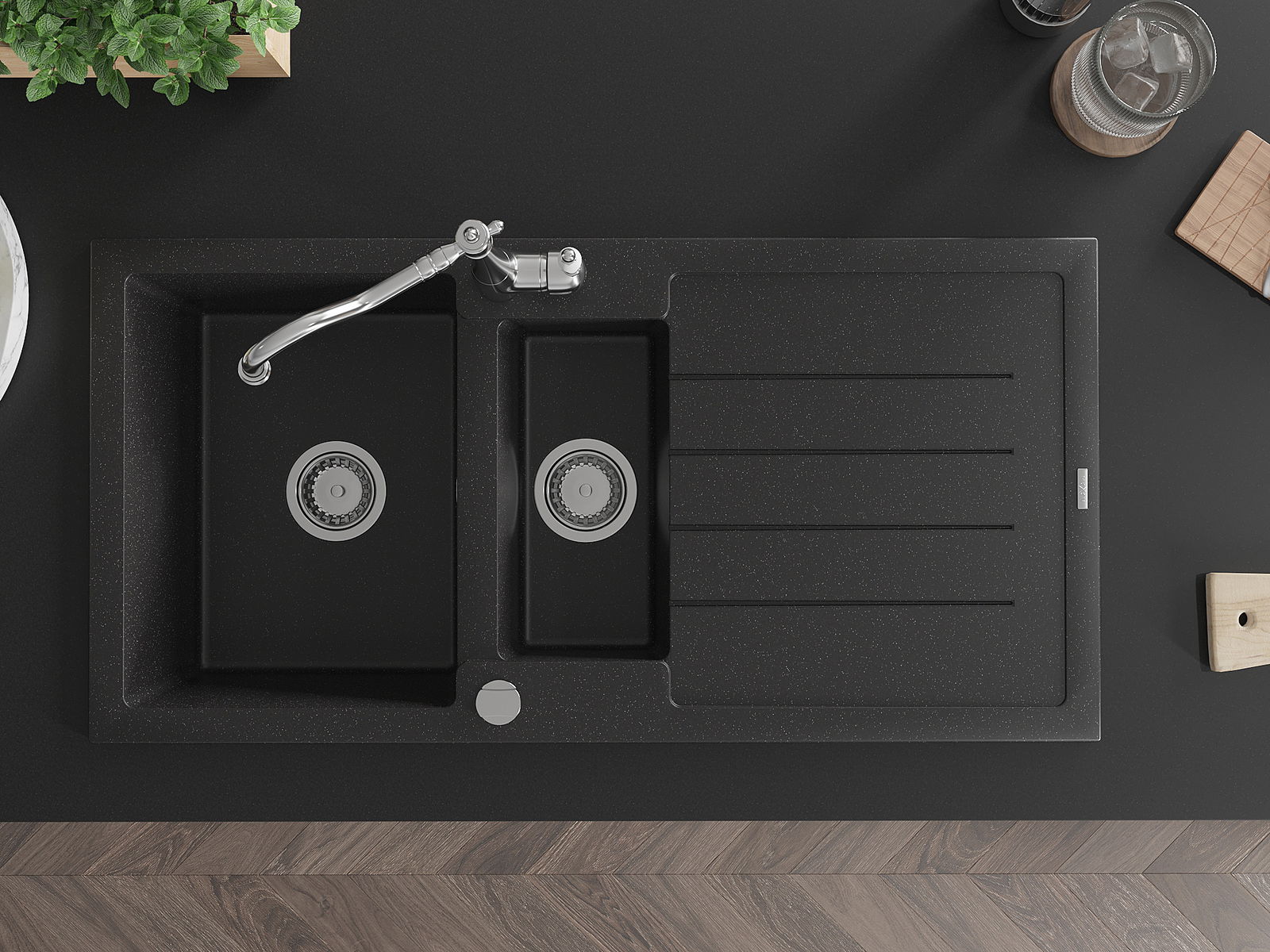 Mexen Andres 1,5 skyrių granitinis plautuvas su nuvarvėjimo skyriumi ir virtuviniu maišytuvu Carla, juodas/sidabrinis