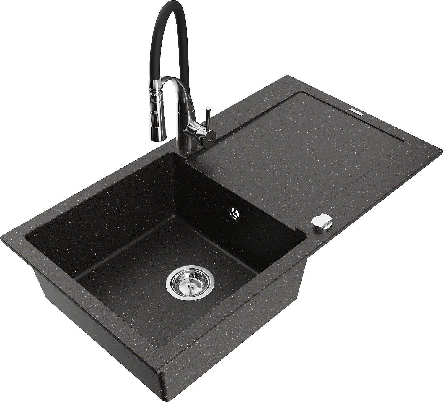 Mexen Leo granitinė vienos sekcijos plautuvė su nusausintuvu ir virtuviniu maišytuvu Aster, juoda/auksinė metalo spalva