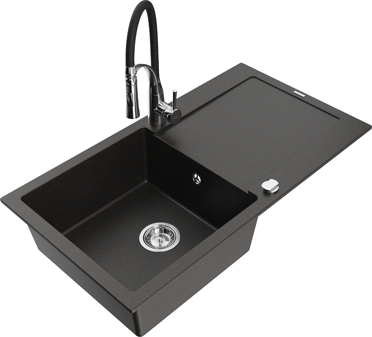 Mexen Leo granitinė virtuvės kriauklė 1 skyrelis su nusausintuvu ir virtuviniu maišytuvu Aster, juodas/auksinis metalik - 6501-?
