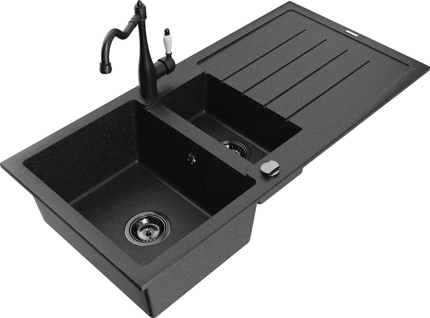 Mexen Andres granitinė 1,5 sekcijų plautuvė su nutekėjimu ir virtuviniu maišytuvu Carla, juoda/sidabrinė - 6515-73-670700-70-B