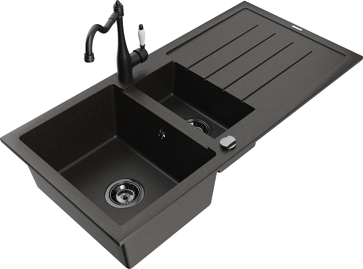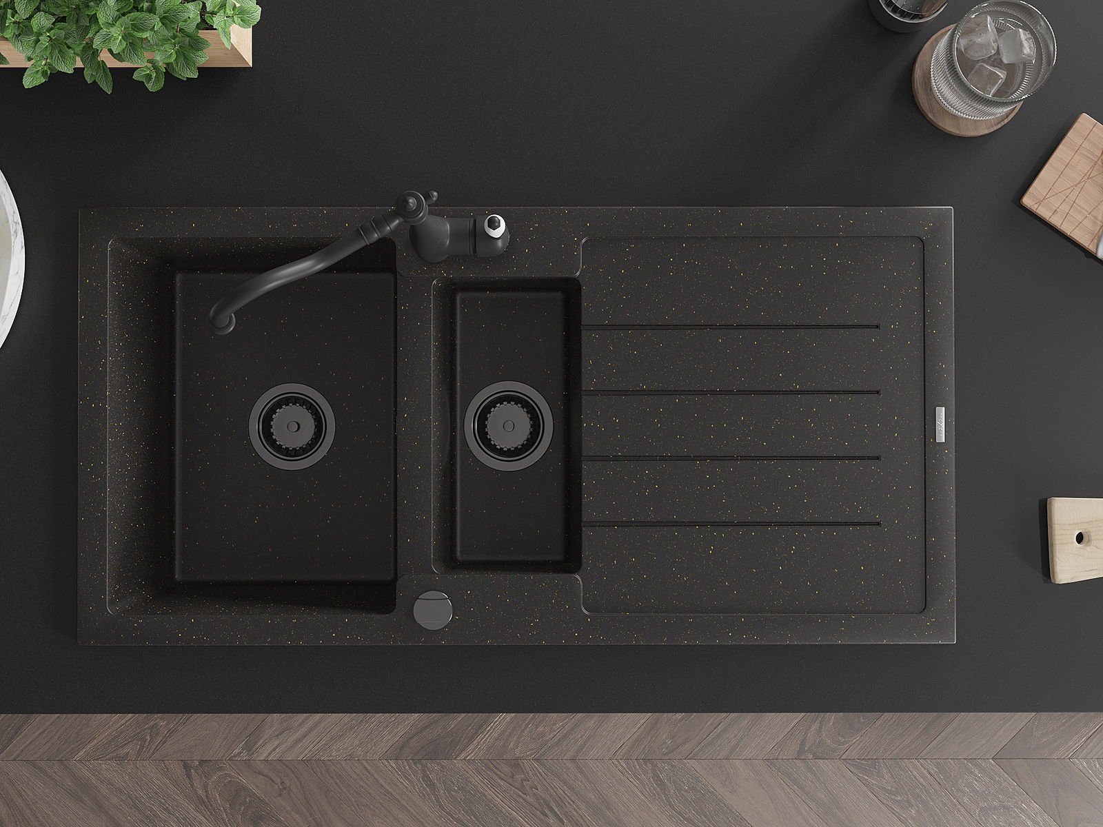 Mexen Andres granito kriauklė 1,5 skyrių su džiovykla ir virtuviniu maišytuvu Carla, juodas/auksinis - 6515-75-670700-70-B