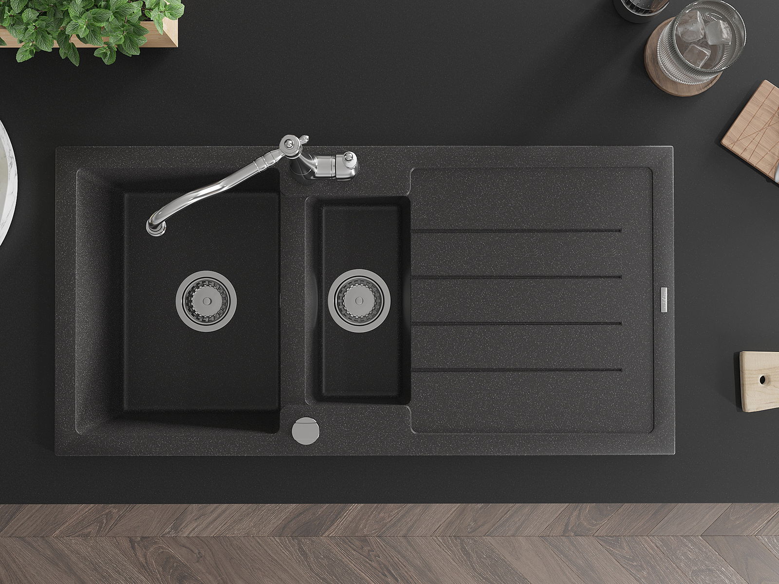 Mexen Andres granitinė virtuvės kriauklė 1,5 dubenėlių su drenažu ir virtuvės maišytuvu Carla, juoda dėmėta - 6515-76-670700-00