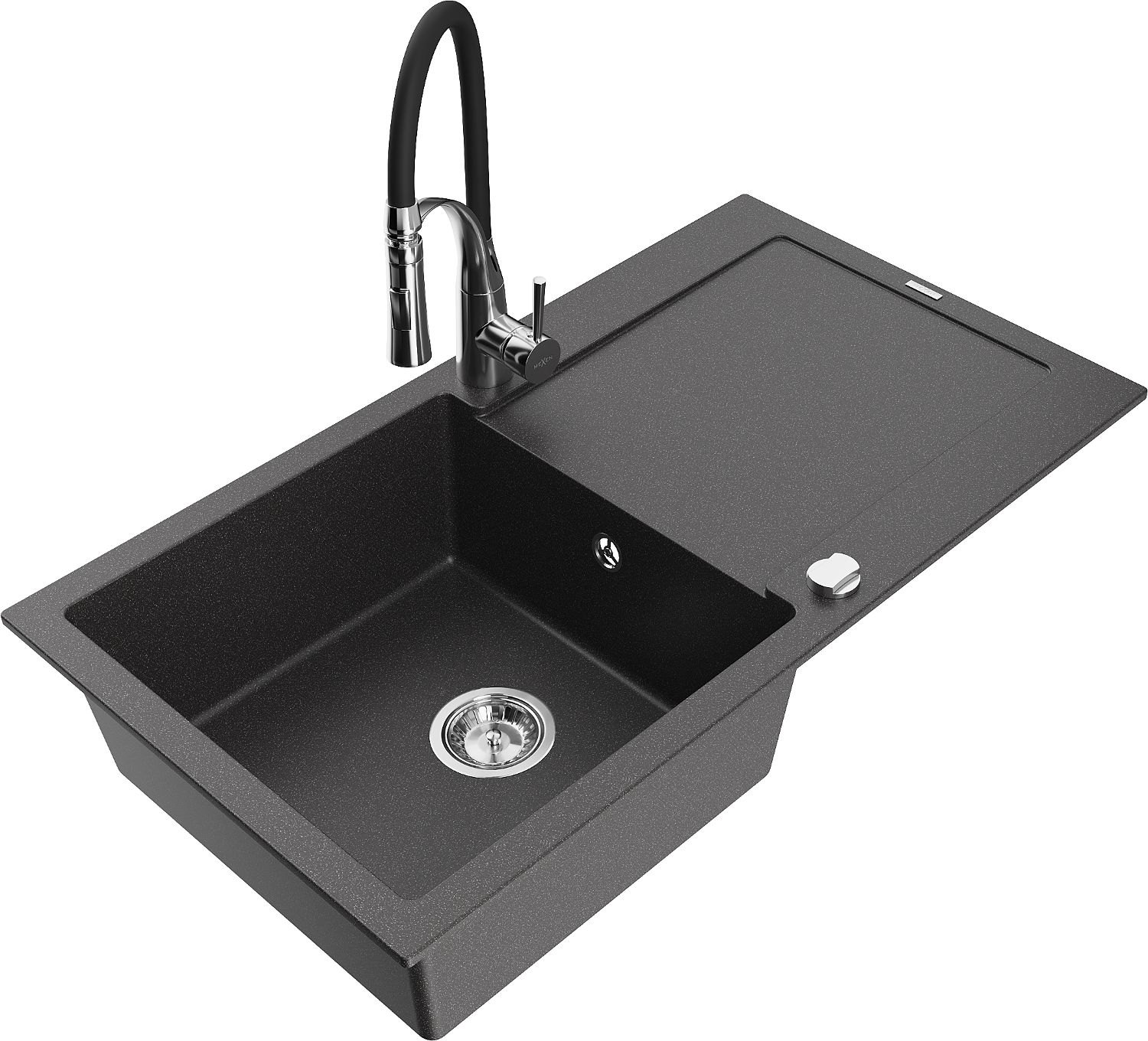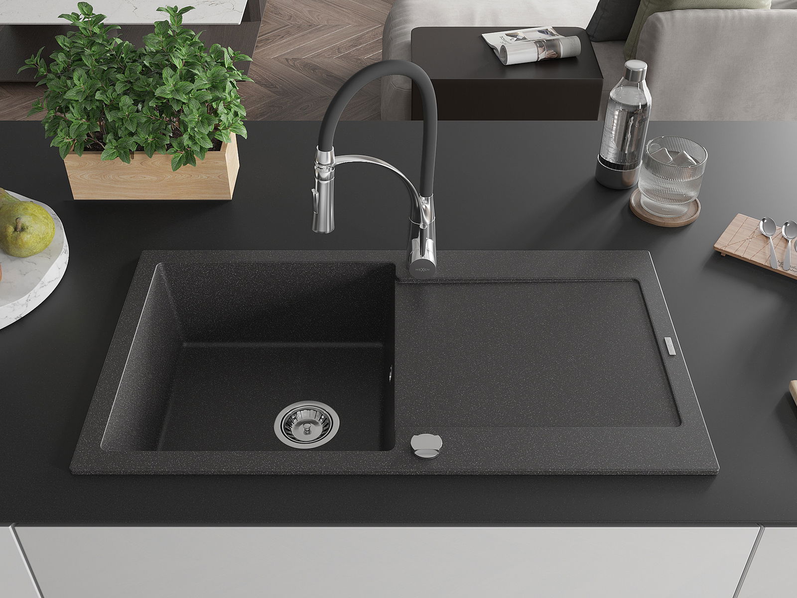 Mexen Leo granitinė vienos kameros kriauklė su nusausintuvu ir virtuviniu maišytuvu Aster, juodas taškuotas
