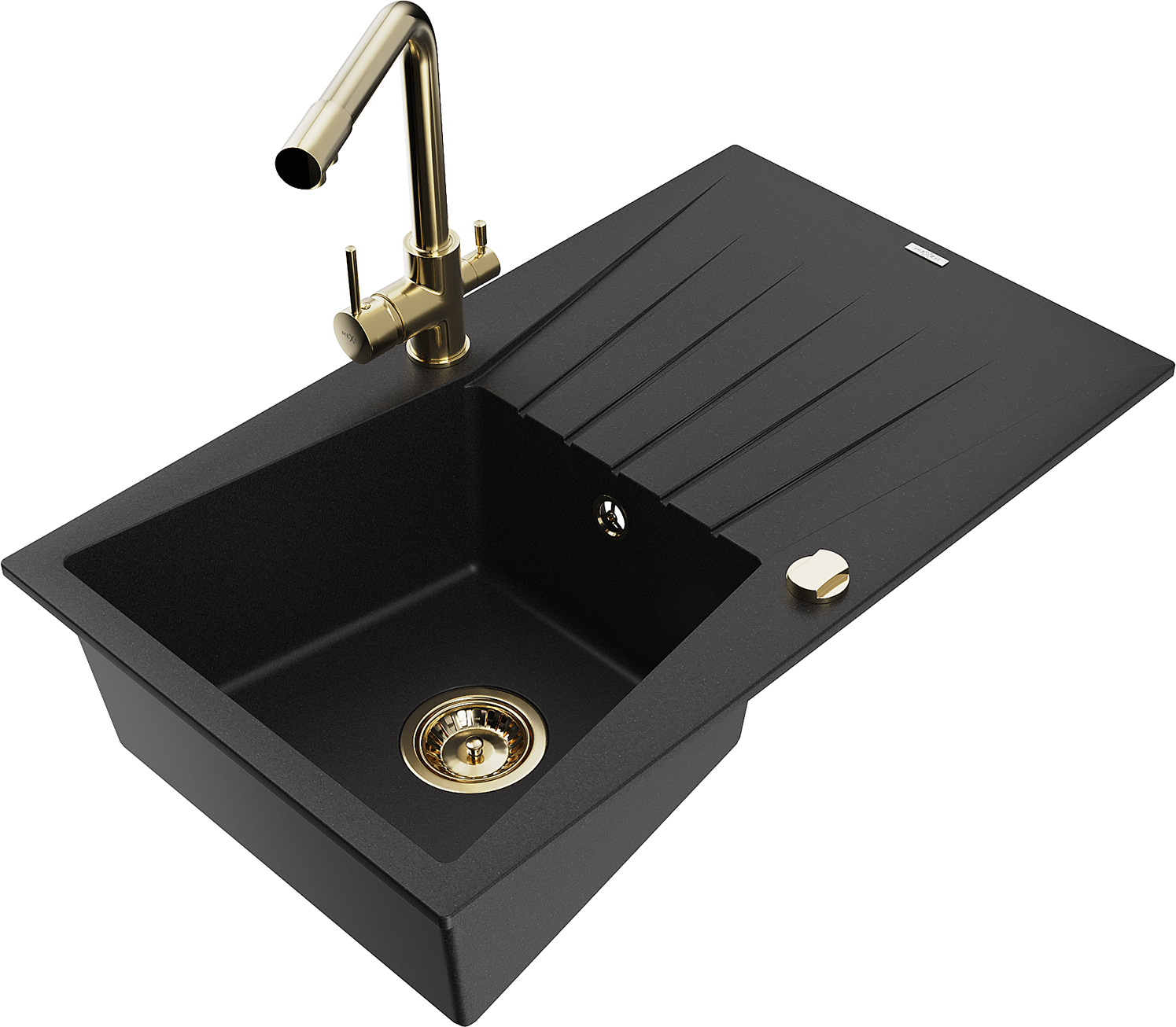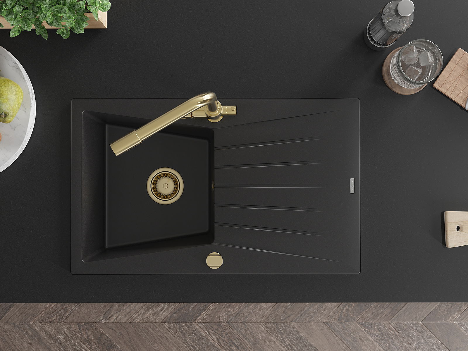 Mexen Cesar granito kriauklė su vienu dubeniu ir nusausikliu bei virtuviniu maišytuvu Duero, juodas - 6514-77-671600-50