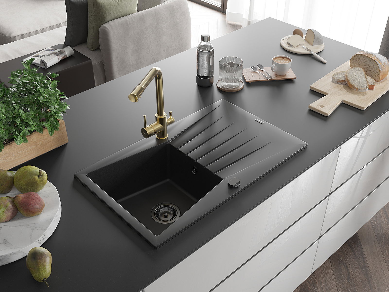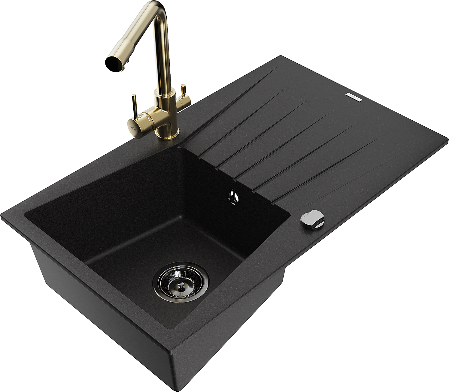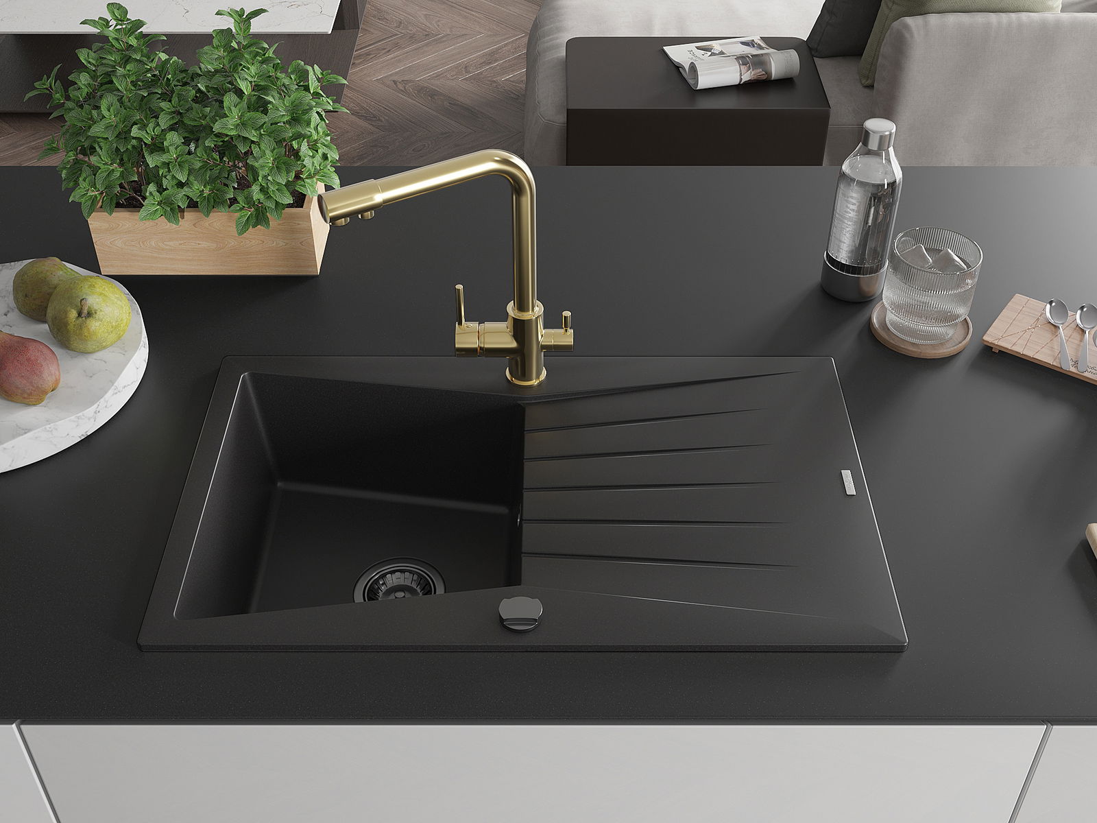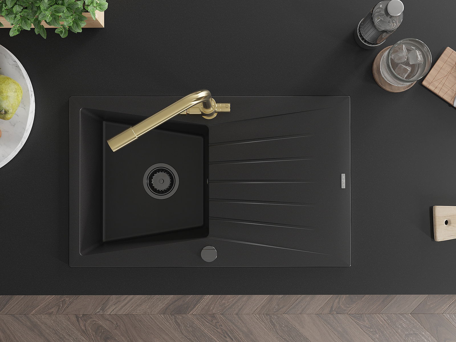Mexen Cesar granitinis vienos dubenies virtuvės plautuvė su nuotėkiu ir virtuviniu maišytuvu Duero, juoda - 6514-77-671600-50-B