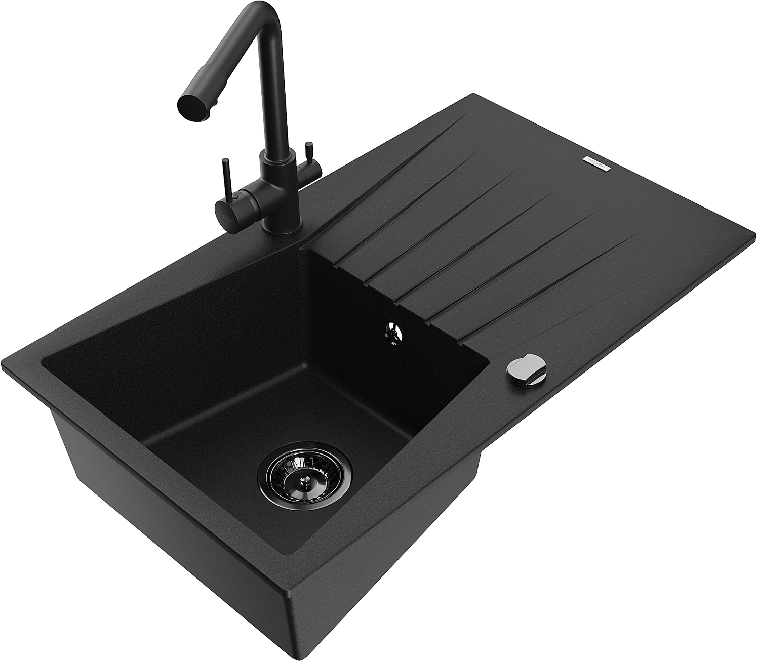 Mexen Cesar granitinis vienos dubenėlės plautuvė su drenažu ir virtuviniu maišytuvu Duero, juoda - 6514-77-671600-70-B