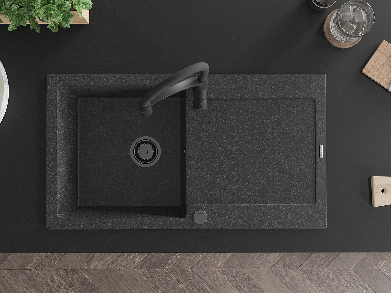 Mexen Leo granitinė vienos kameros plautuvė su nusausinimu ir virtuvės maišytuvu Aster, juoda dėmėta - 6501-76-73450-70-B