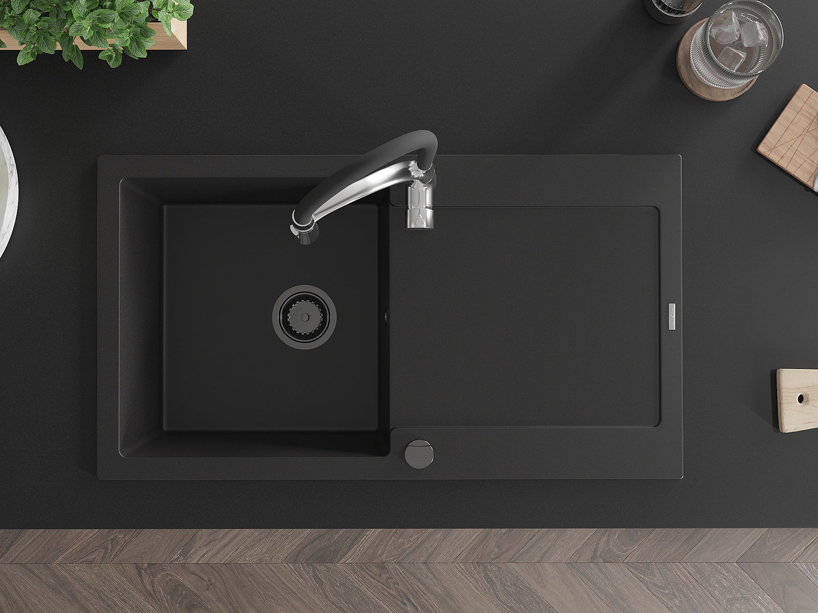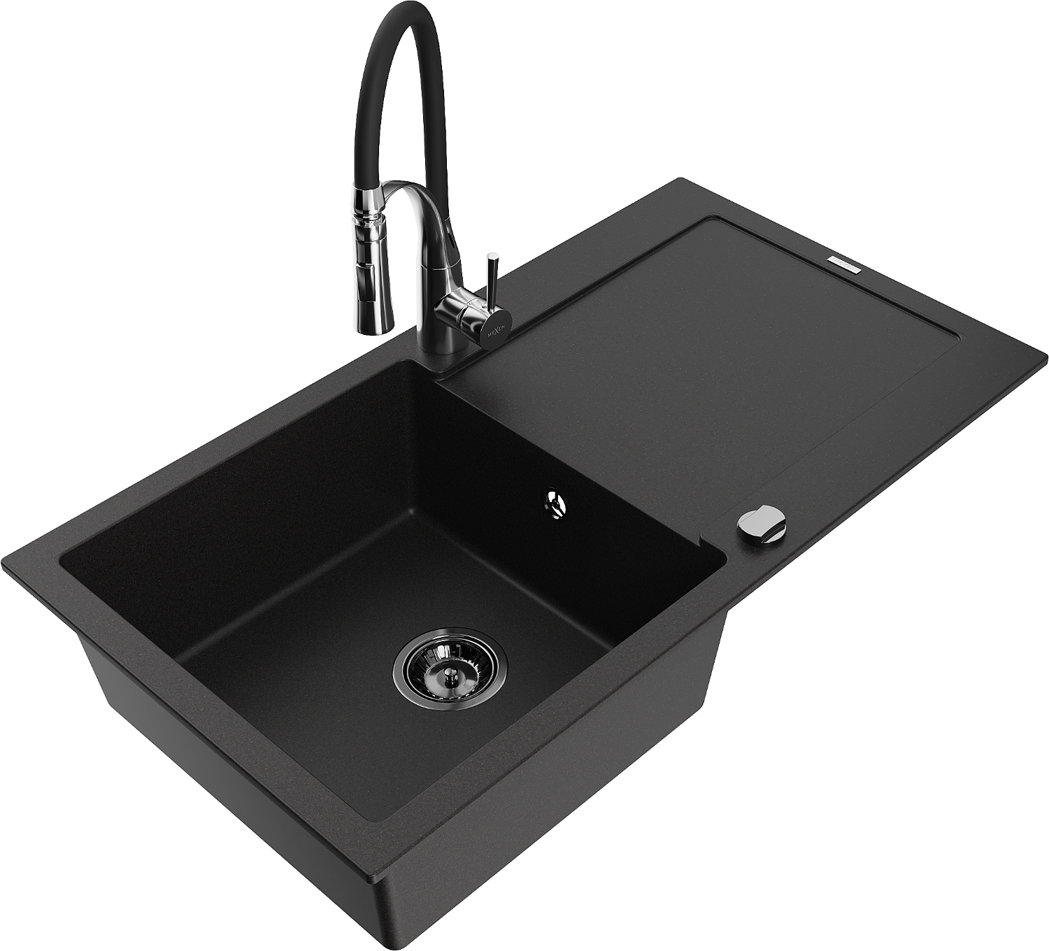 Mexen Leo 1-dubenų granitinė kriauklė su nutekėjimu ir virtuvės maišytuvu Aster, juoda - 6501-77-73450-07-B