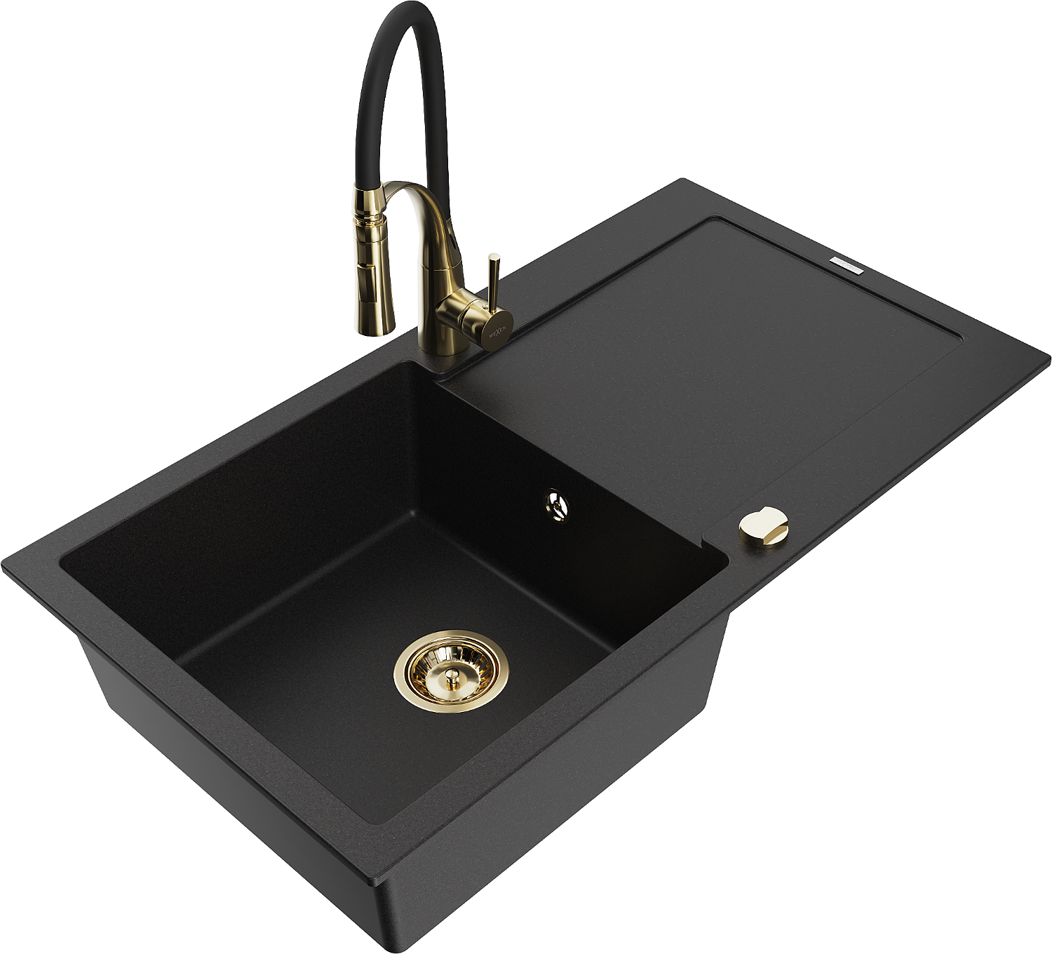 Mexen Leo granitinė vienos kameros plautuvė su nutekėjimu ir virtuviniu maišytuvu Aster, juoda - 6501-77-73450-57-G