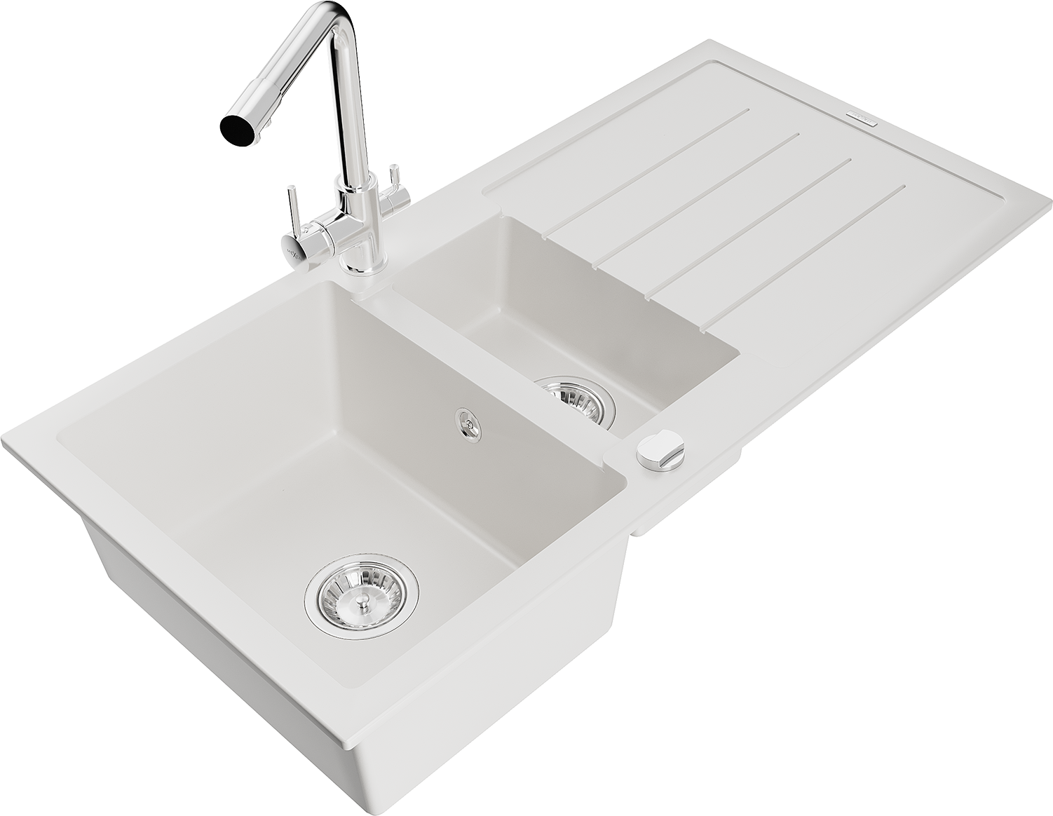 Mexen Andres granitinė 1,5 kameros virtuvinė kriauklė su nuovaromis ir Duero virtuviniu maišytuvu, balta - 6515-20-671600-00
