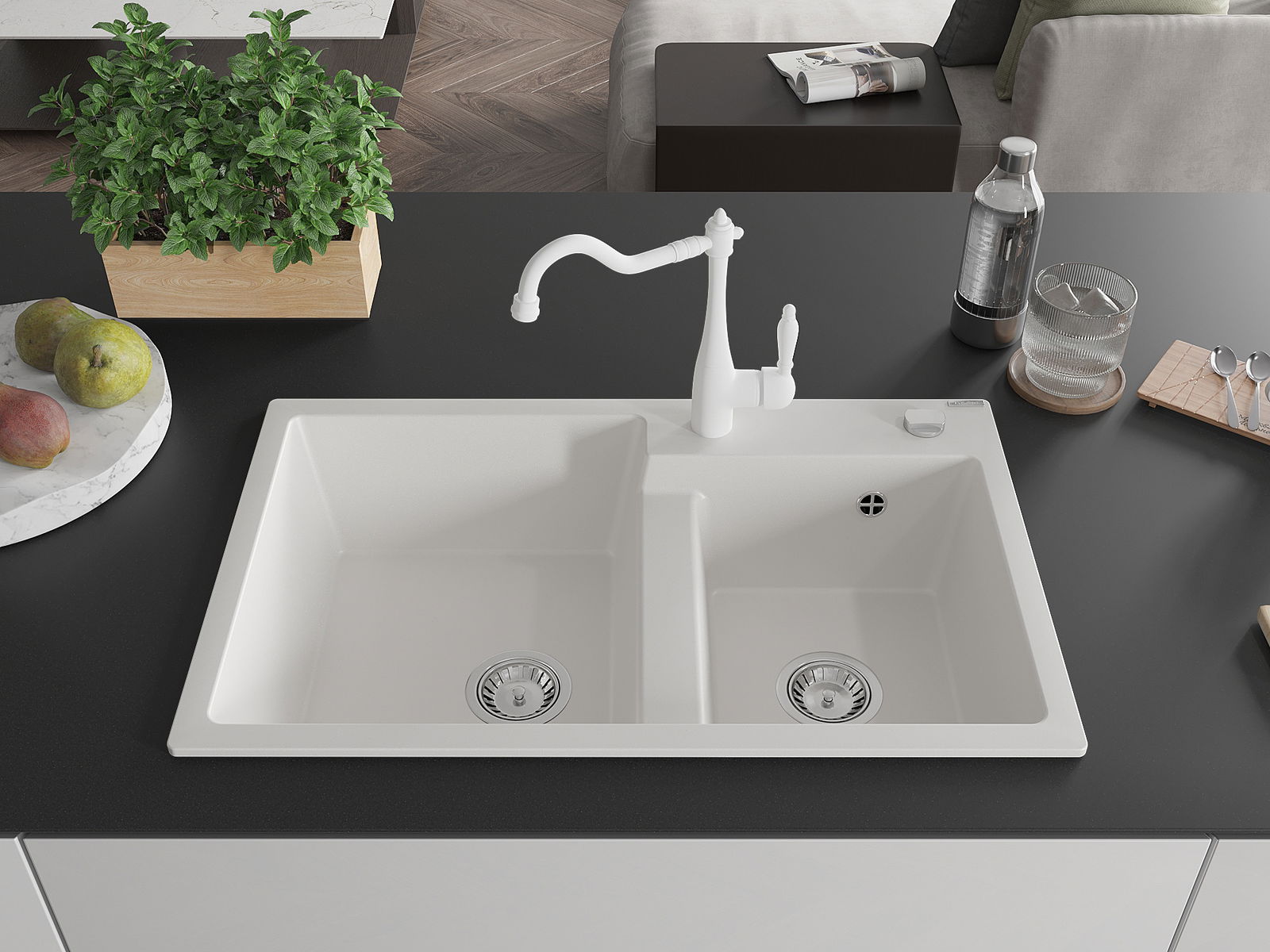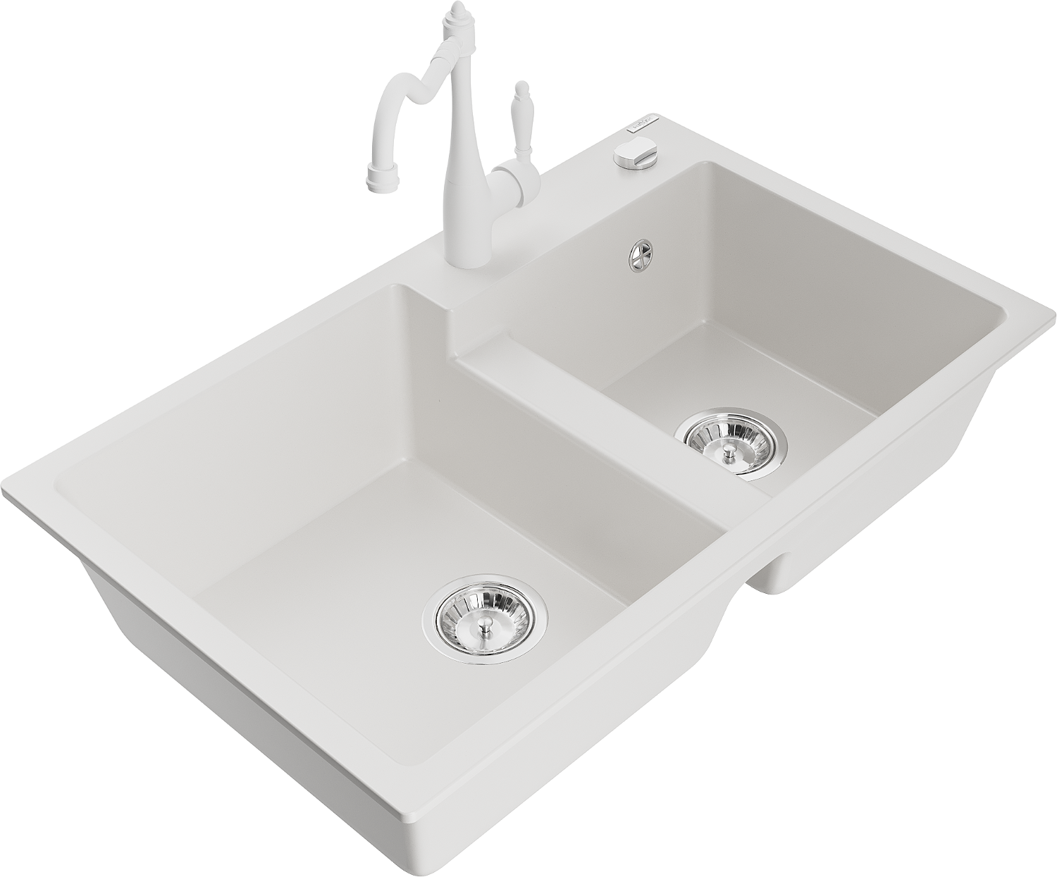 Mexen Tomas granitinis dvigubas plautuvės komplektas su virtuviniu maišytuvu Carla, baltas - 6516-20-670700-20