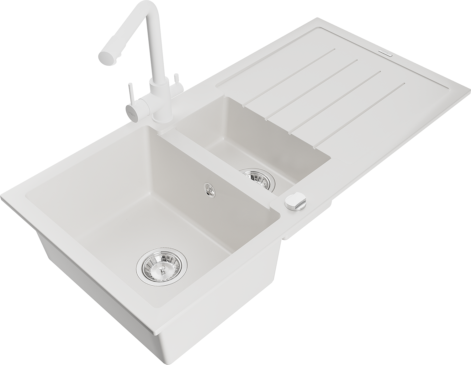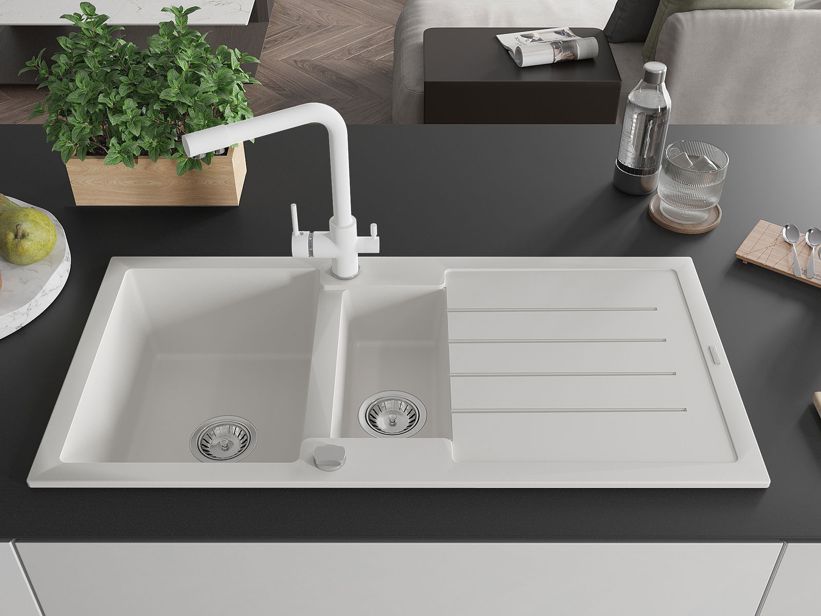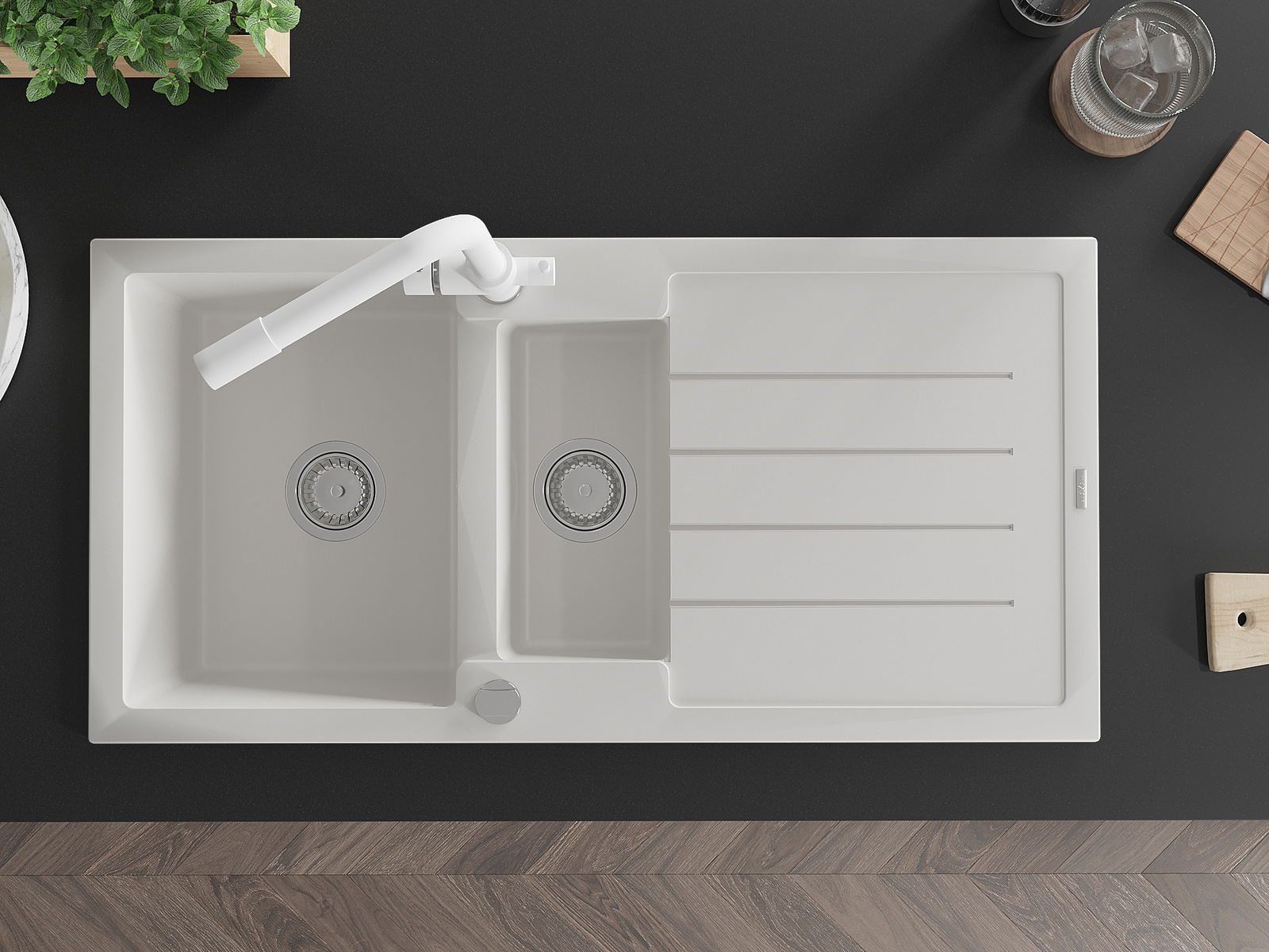 Mexen Andres granito plautuvė 1,5 kamerų su nubėgėju ir virtuvės maišytuvu Duero, balta - 6515-20-671600-20