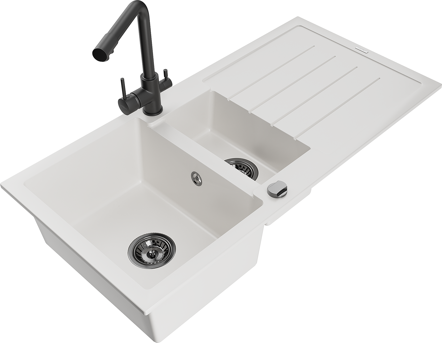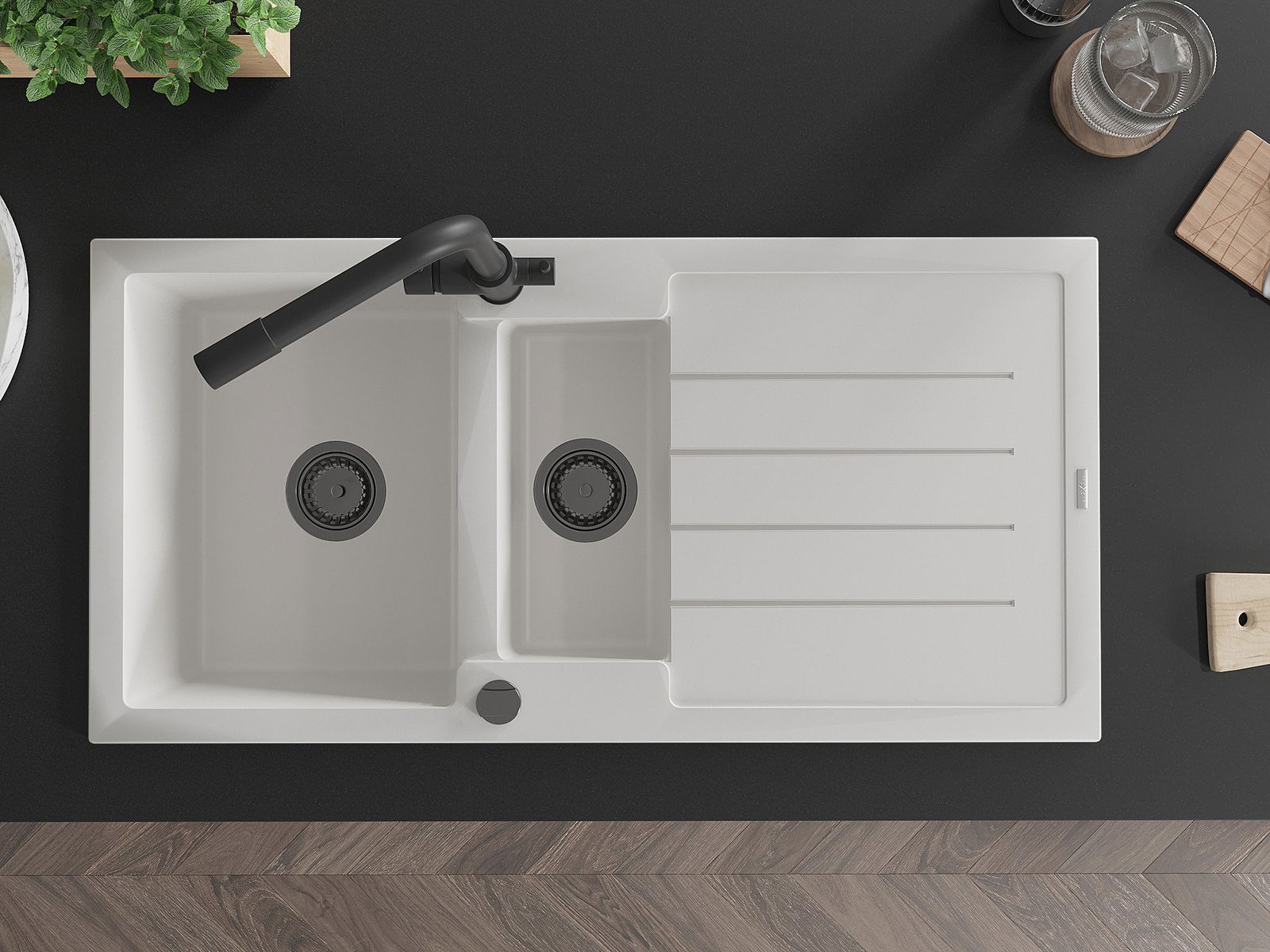 Mexen Andres granitinis 1,5 skylių indaplovė su nutekėjimu ir virtuvės maišytuvu Duero, balta - 6515-20-671600-70