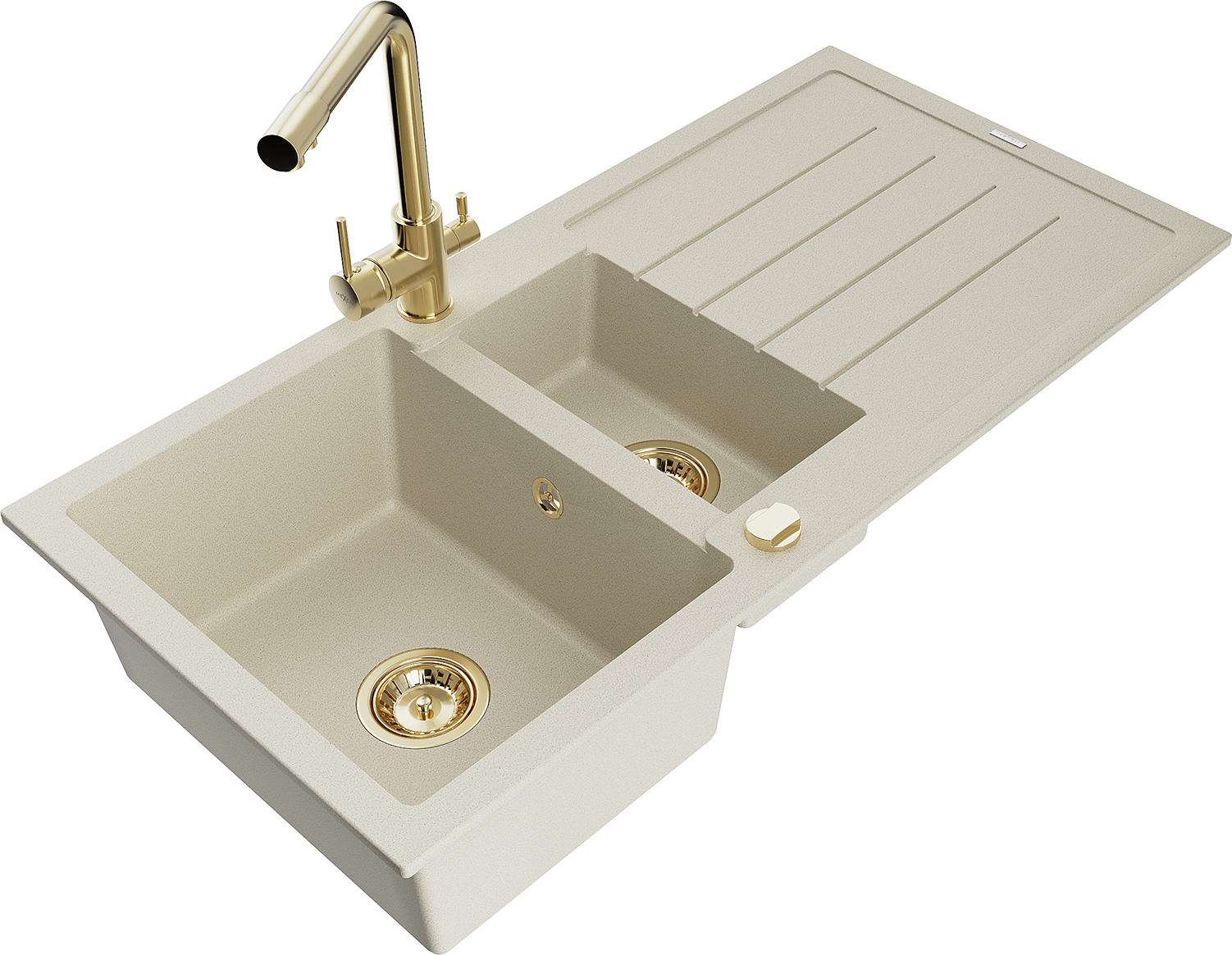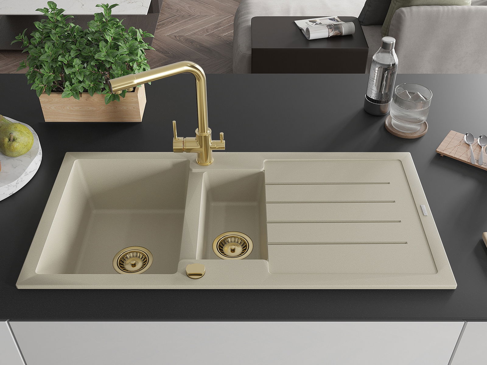 Mexen Andres granitinė 1,5 sekcijų kriauklė su nusausintuvu ir virtuviniu maišytuvu Duero, smėlio spalvos - 6515-69-671600-50