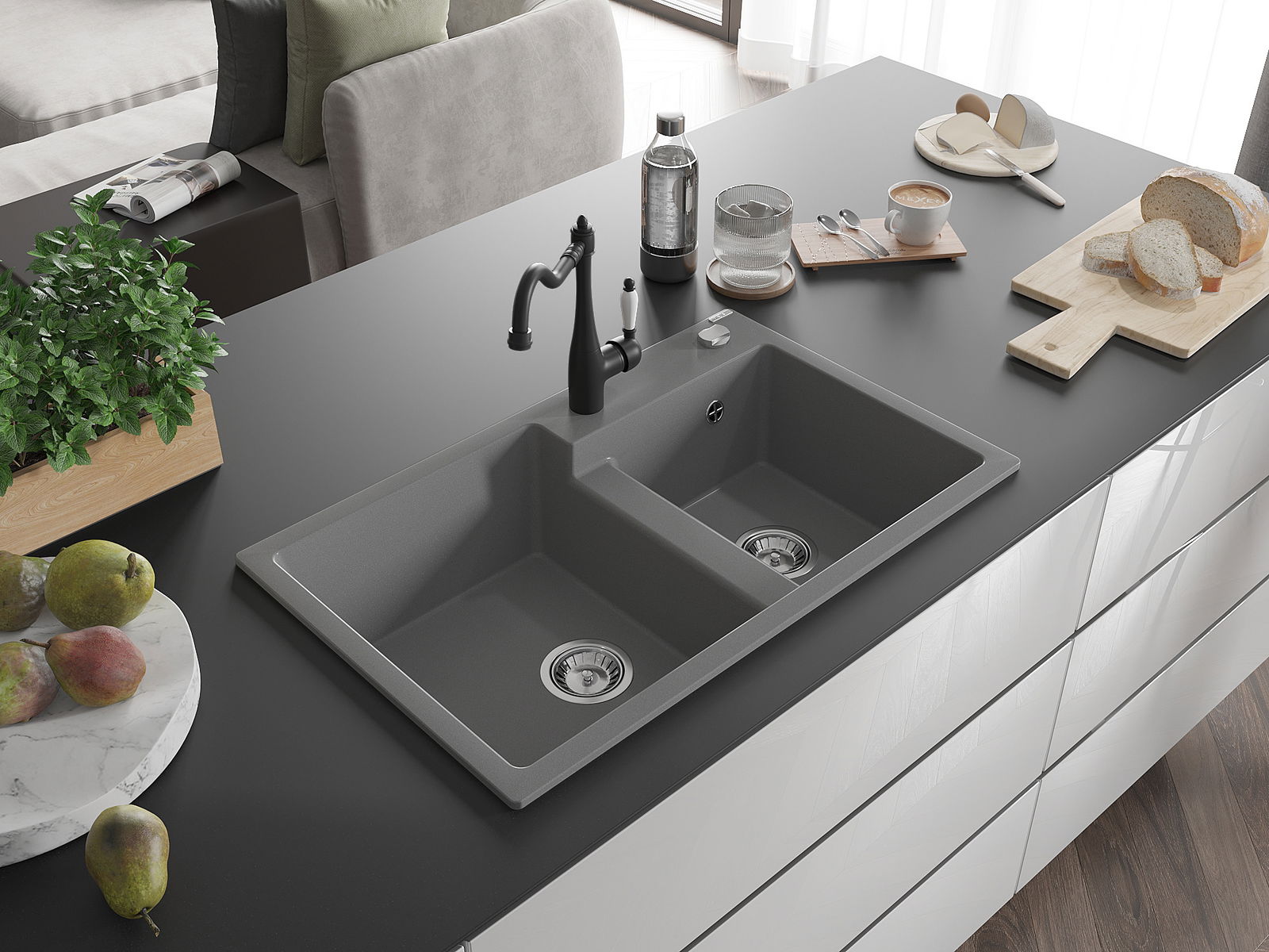 Mexen Tomas granitinė dviejų kamerų plautuvė su virtuviniu maišytuvu Carla, pilkas - 6516-71-670700-70
