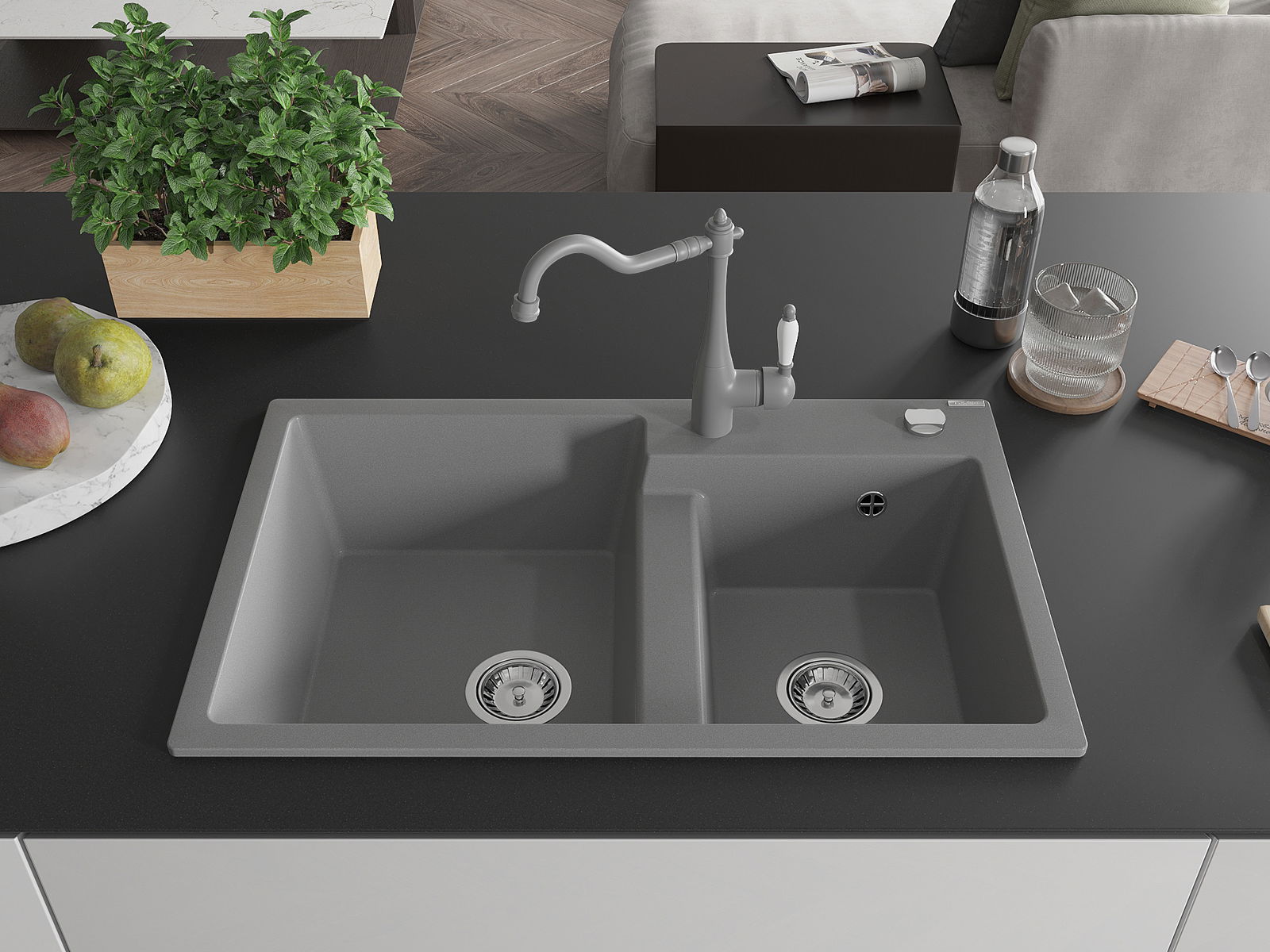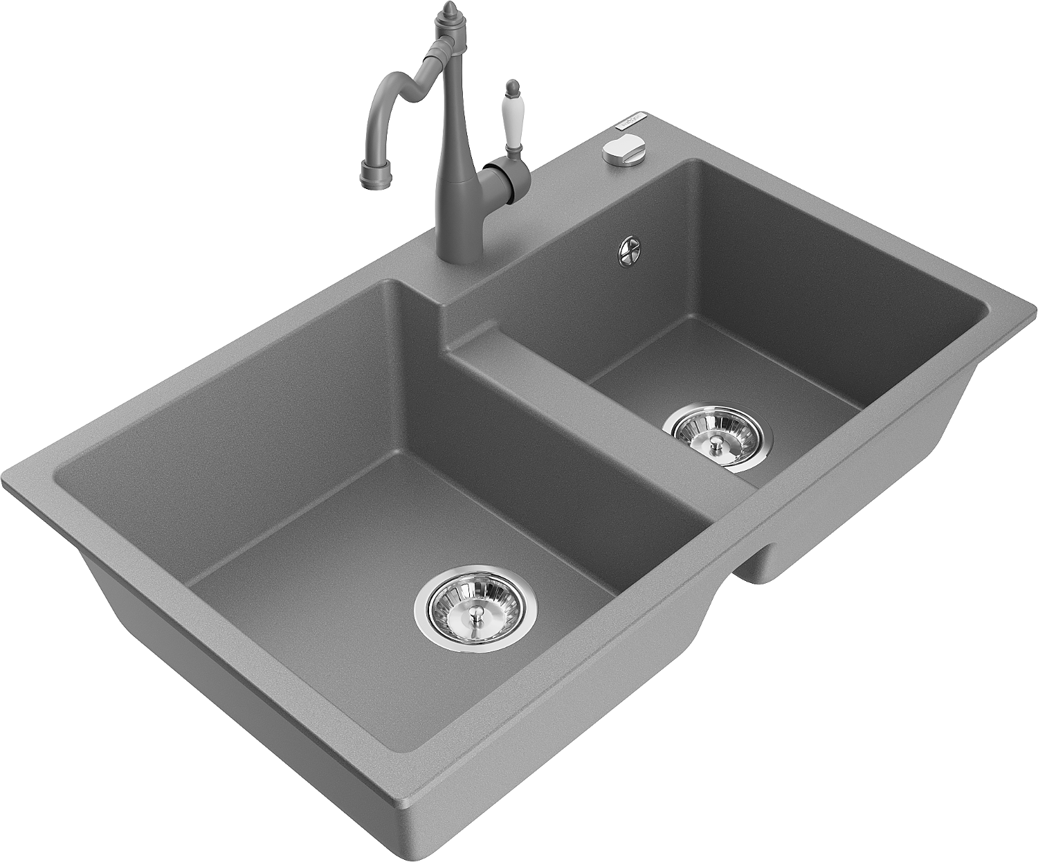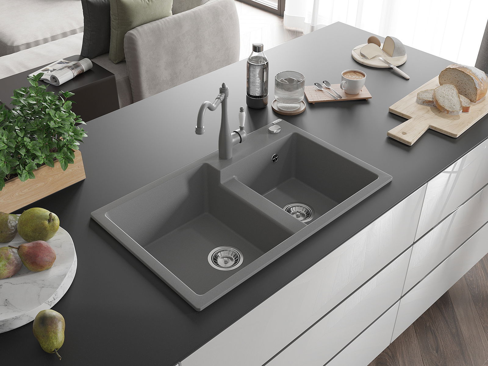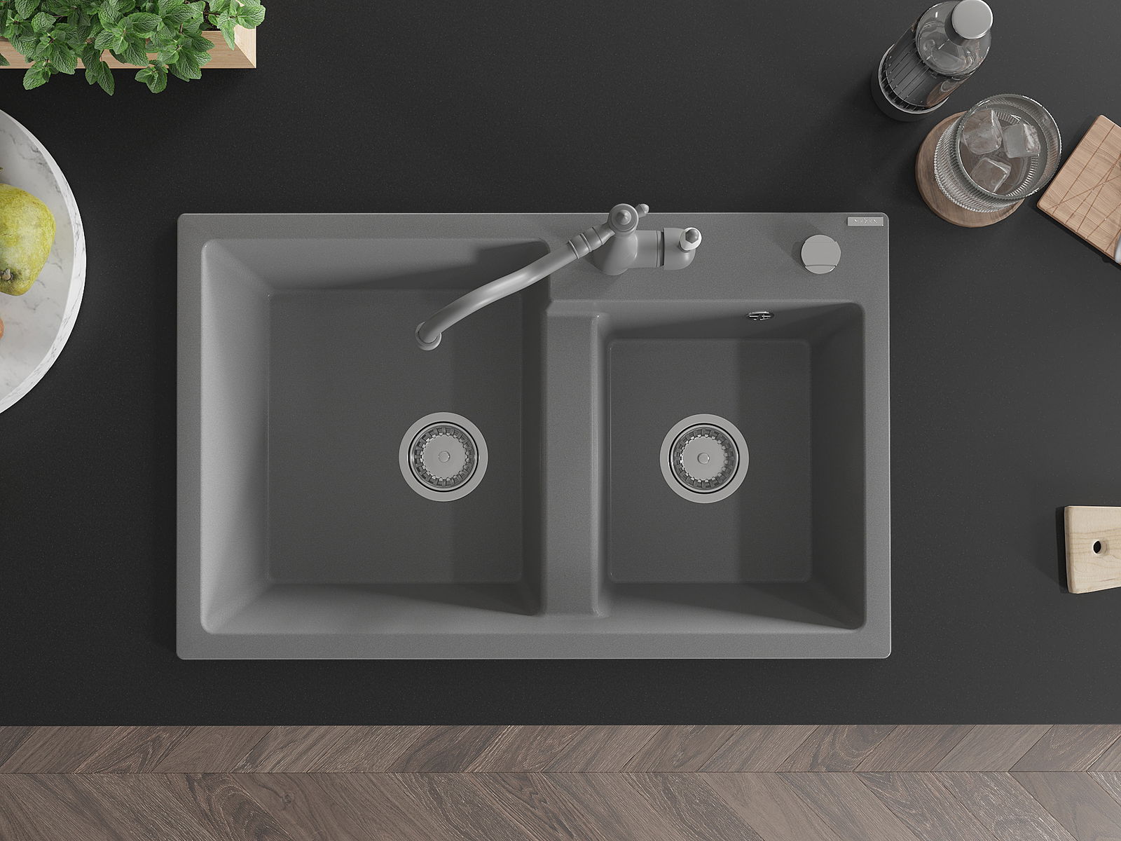 Mexen Tomas granitinė 2-jų kamerų plautuvė su virtuviniu maišytuvu Carla, pilka - 6516-71-670700-71