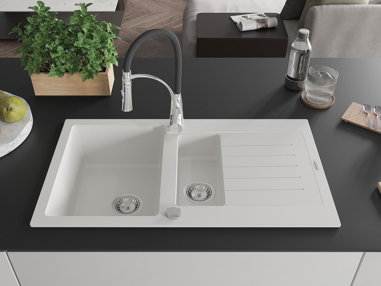 Mexen Matias granitinė 1,5 skyrių plautuvė su nusausintuvu ir virtuviniu maišytuvu Aster, balta - 6502-20-73450-07