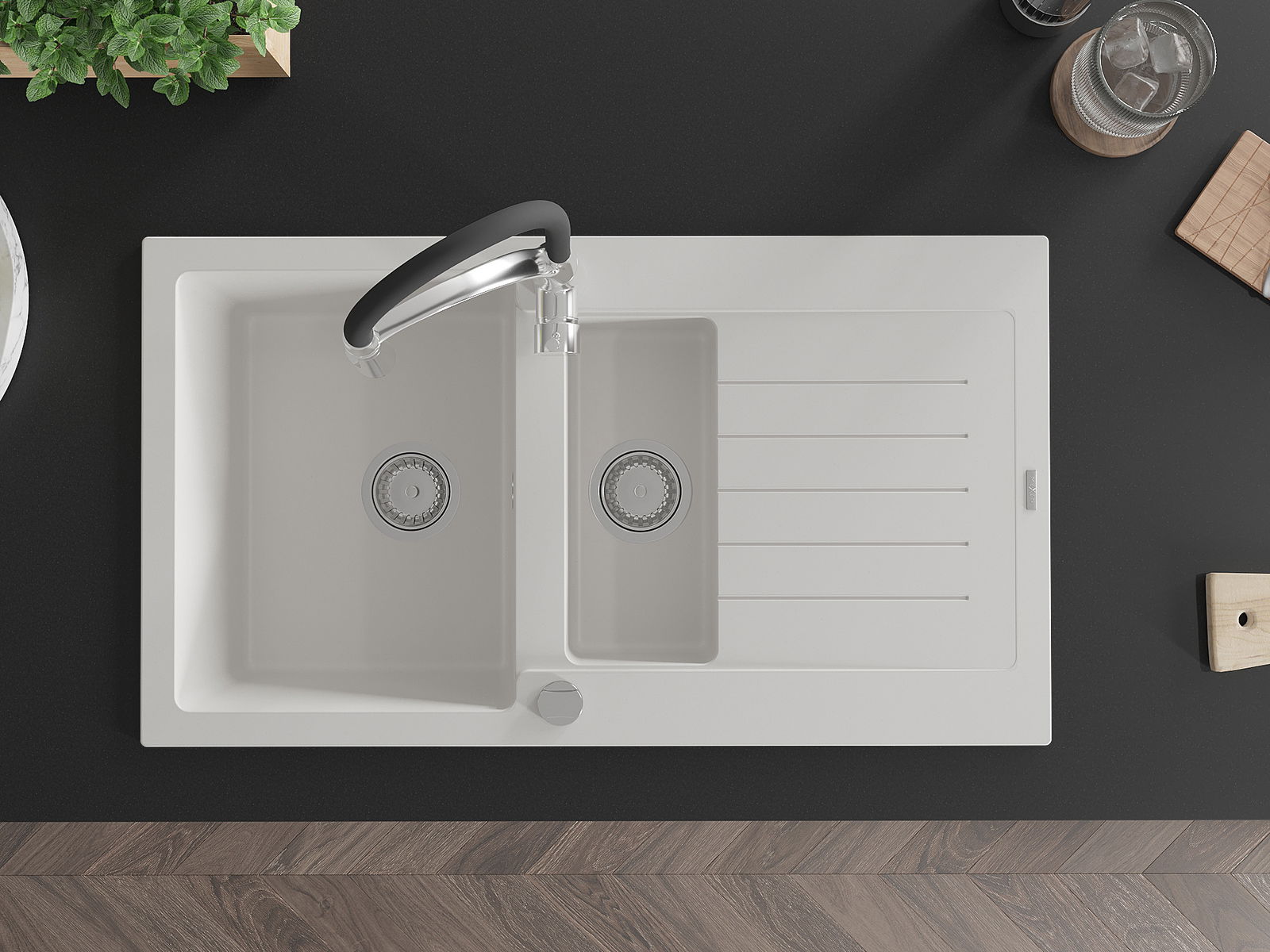Kriauklės paviršius yra atsparūs dėmėms ir spalvos pasikeitimui, dėl kurio lengva valyti ir ilgą laiką išlaikyti savo spalvą. Estetinis ir praktiškai papildantis kiekvieną virtuvę.