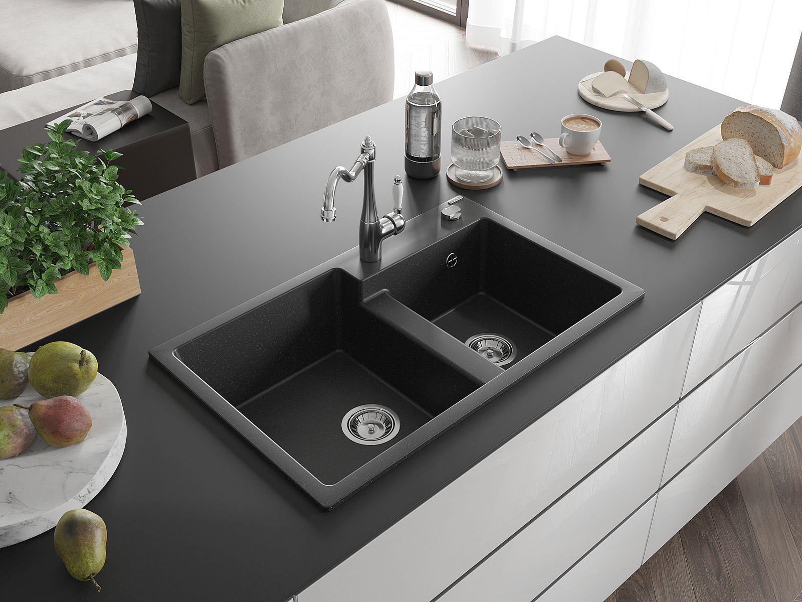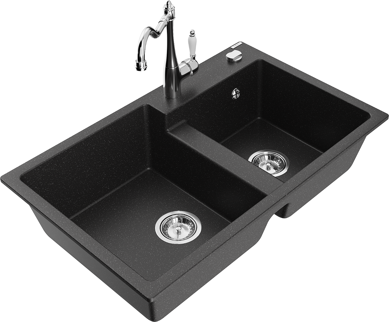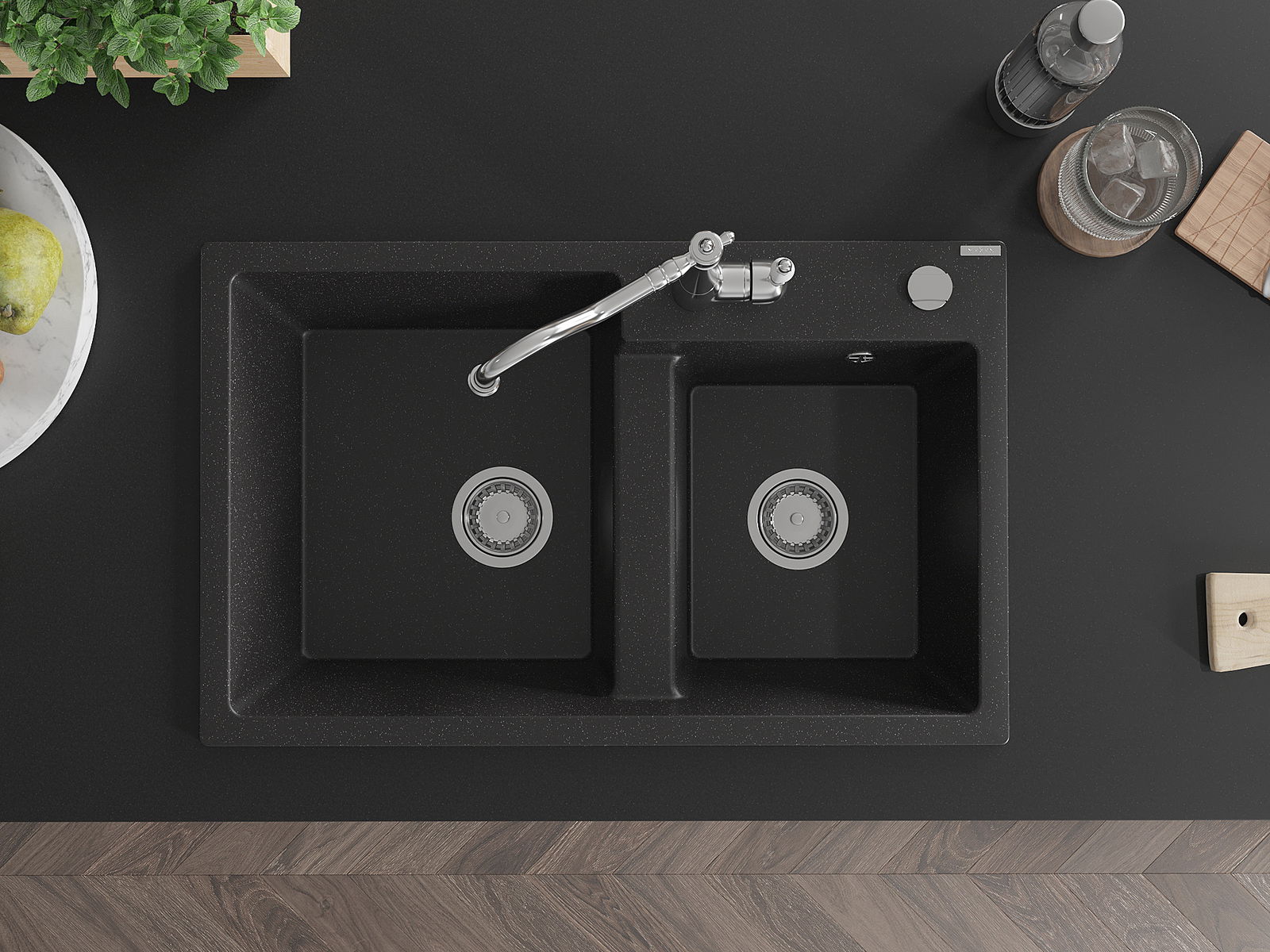 Mexen Tomas dviejų skylių granitinė kriauklė su virtuviniu maišytuvu Carla, juoda/sidabrinis metalo efektas - 6516-73-670700-00