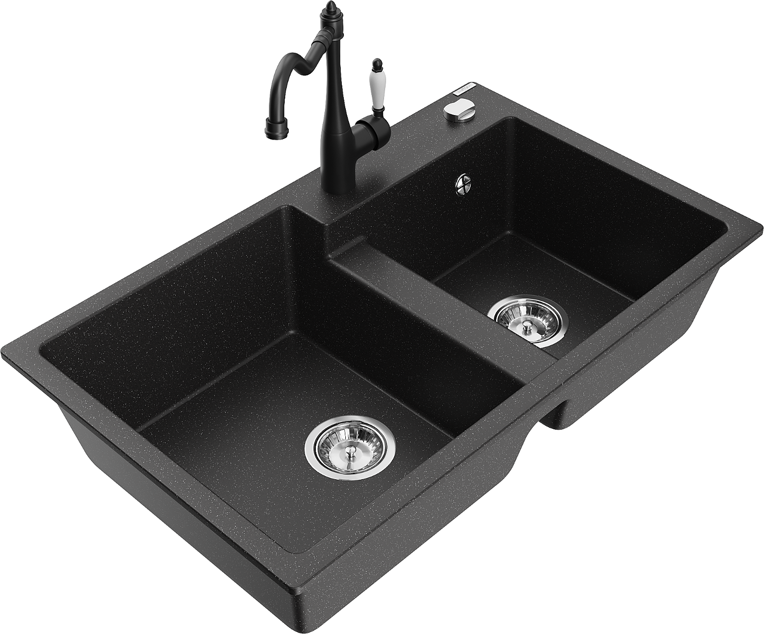 Mexen Tomas 2 kamerų granito plautuvė su virtuvės maišytuvu Carla, juoda/sidabrinis metalo efektas - 6516-73-670700-70