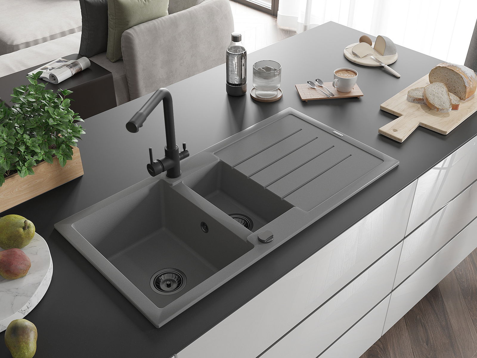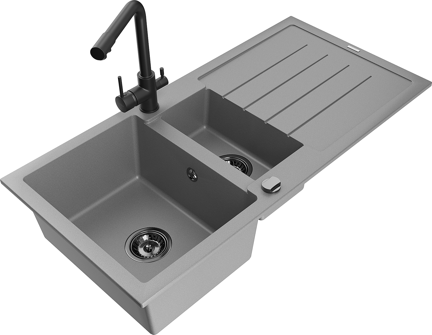Mexen Andres granito kriauklė su 1,5 kasečių ir nusausintuvu bei virtuviniu maišytuvu Duero, pilkas - 6515-71-671600-70-B