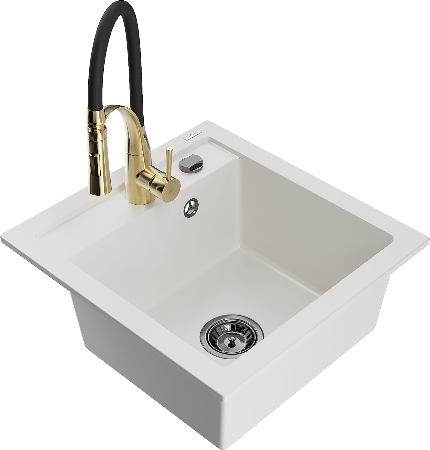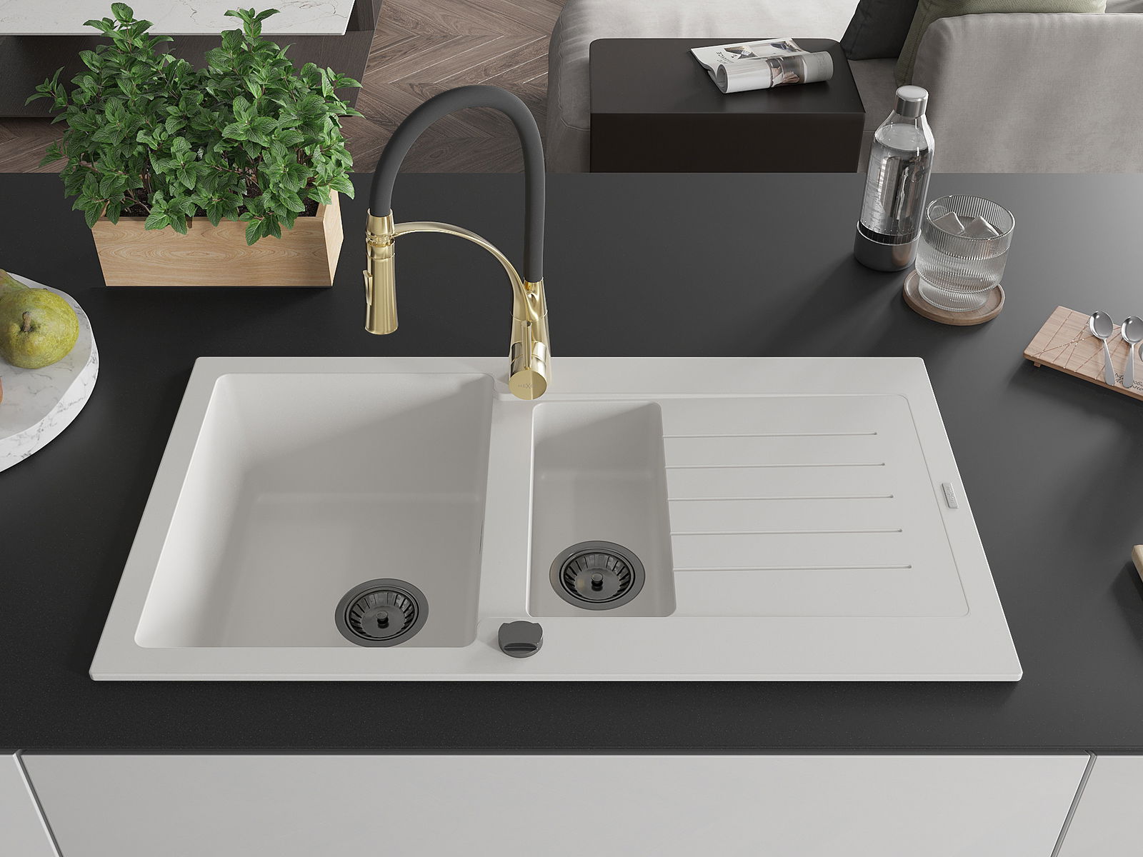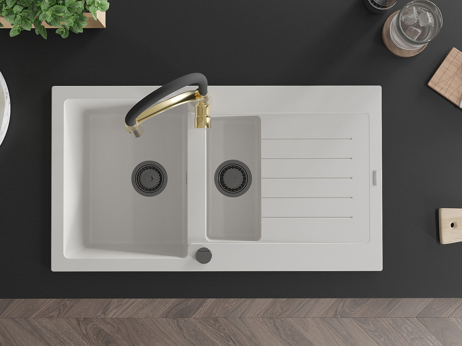 Mexen Matias granito plautuvė 1,5 sekcijų su nubėgimu ir virtuviniu maišytuvu Aster, baltas - 6502-20-73450-57-B