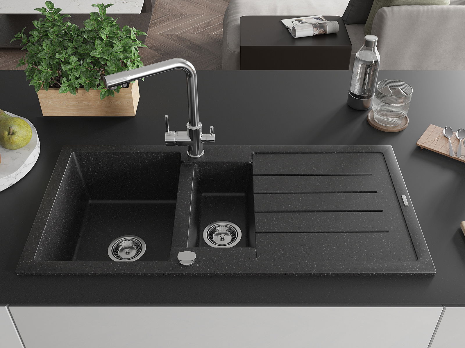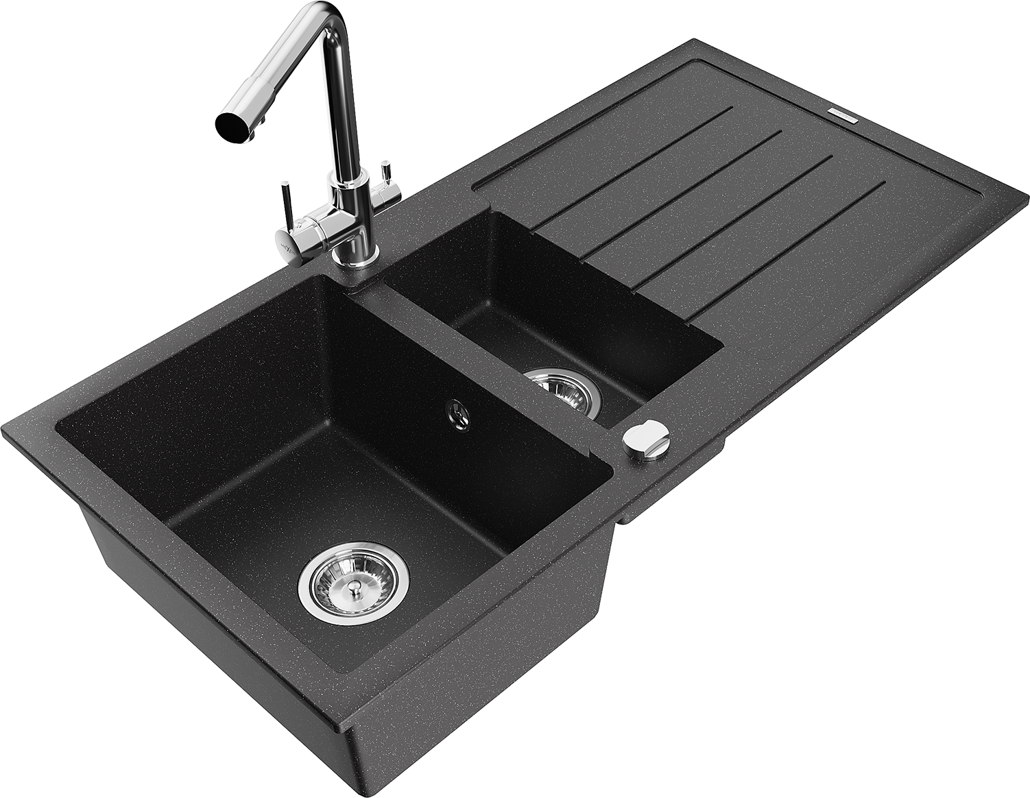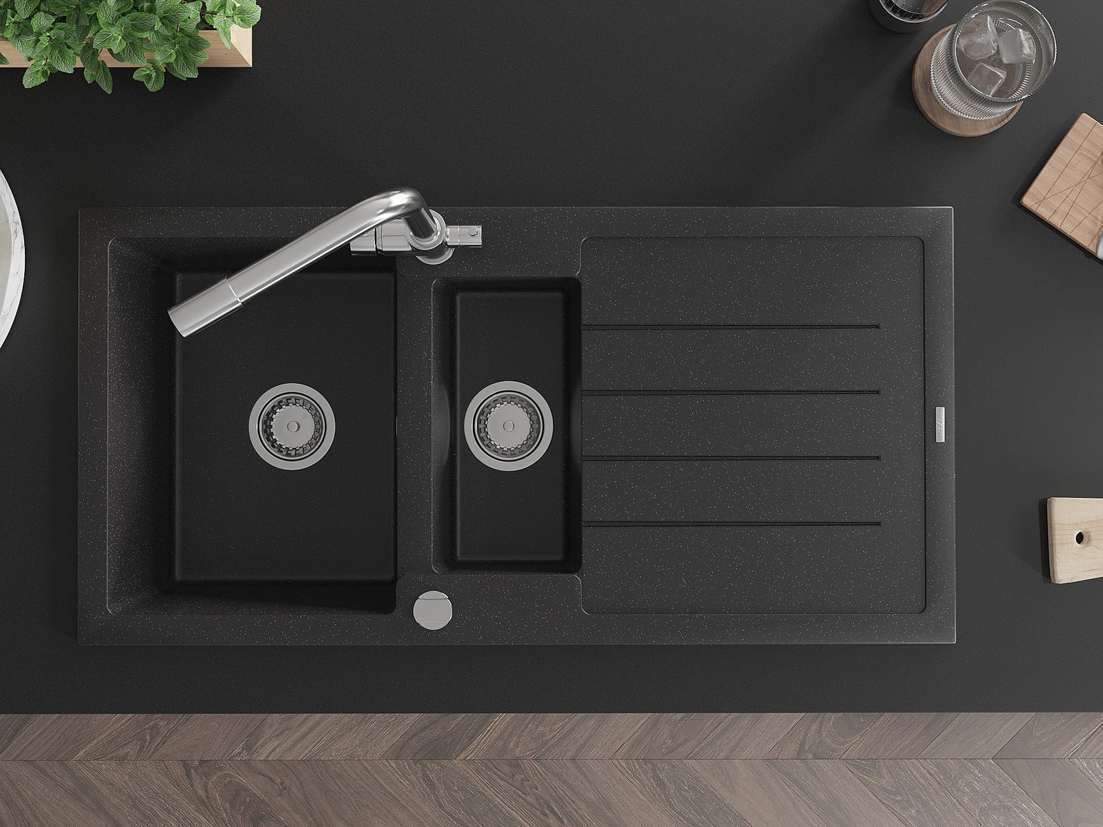 Mexen Andres granito kriauklė 1,5 kamerų su nubėgimo lentyna ir virtuviniu maišytuvu Duero, juoda/sidabrinė - 6515-73-671600-00