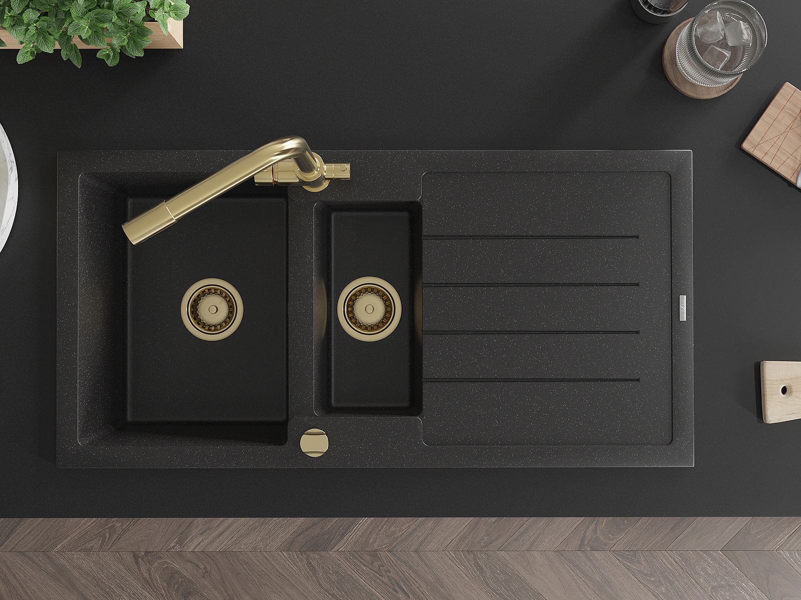Kriauklė turi 2 iš anksto frezuotas skyles, kurių skersmuo yra 35 mm, skirtas savarankiškam išmušimui. Jas galima naudoti, pavyzdžiui, skysčio dozatoriaus montavimui, kuris pašalins plastikinių butelių buvimą virtuvėje ir suteiks jai elegantišką apdailą.