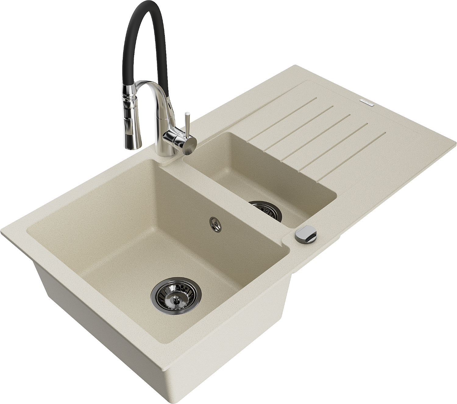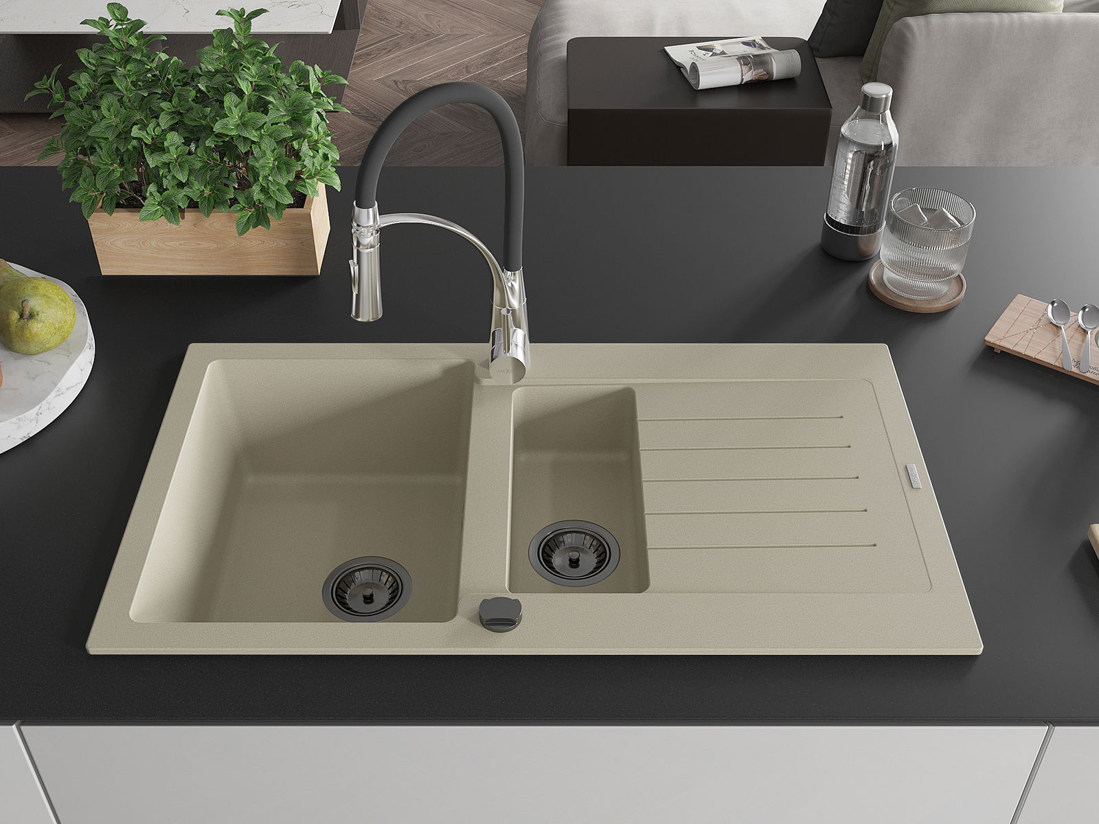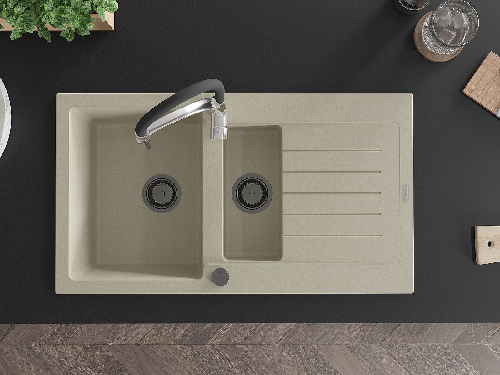 Mexen Matias granitinis plautuvė 1,5 skylių su nuvarvėtoju ir virtuvės maišytuvu Aster, smėlio spalvos - 6502-69-73450-07-B