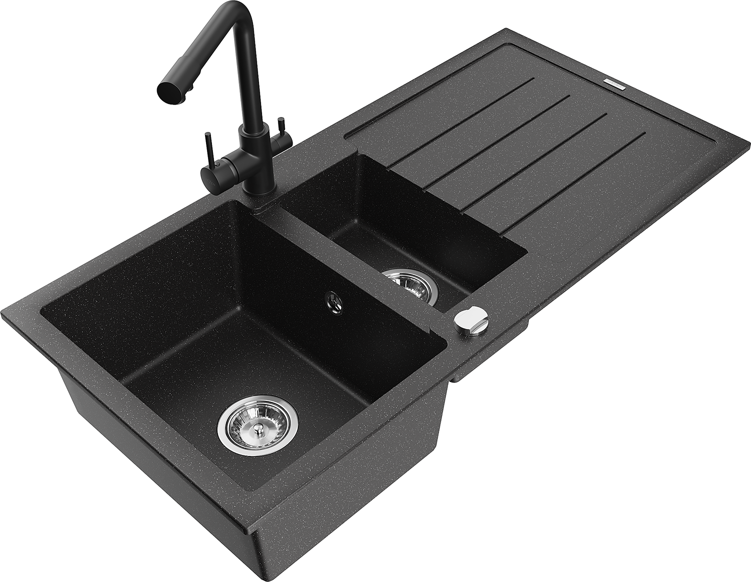 Mexen Andres granitinis virtuvės kriauklė 1,5 su lašintuvu ir virtuviniu maišytuvu Duero, juoda/sidabrinė - 6515-73-671600-70