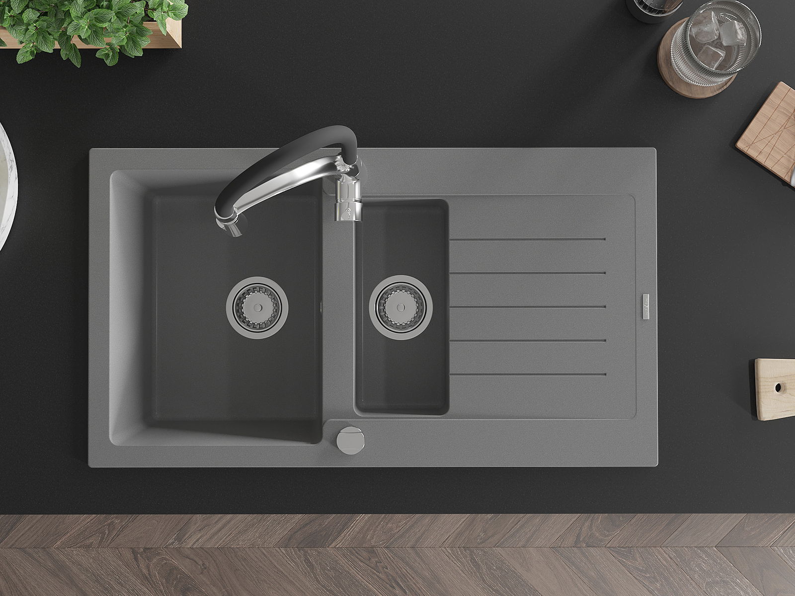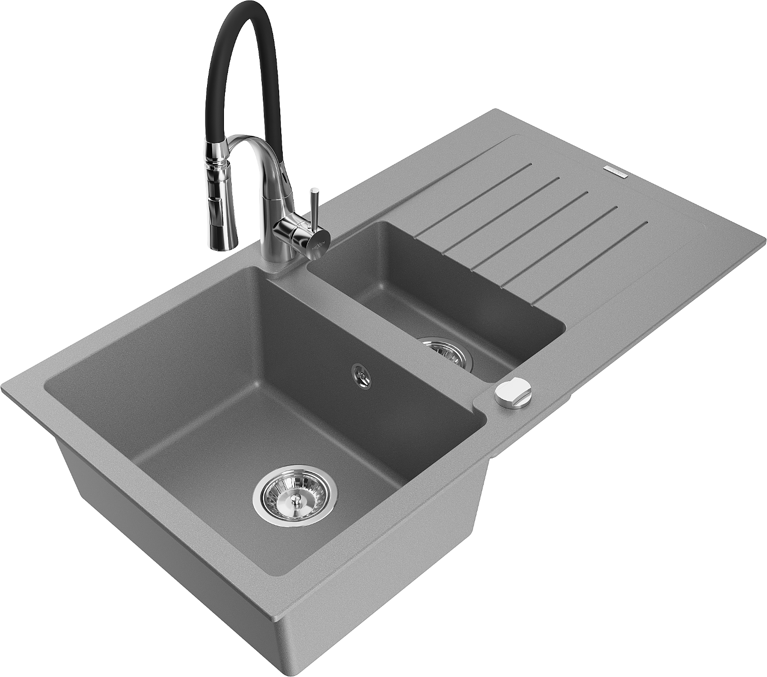 Mexen Matias granitinis 1,5 kameros kriauklė su nutekėjimu ir virtuvės maišytuvu Aster, pilka - 6502-71-73450-07