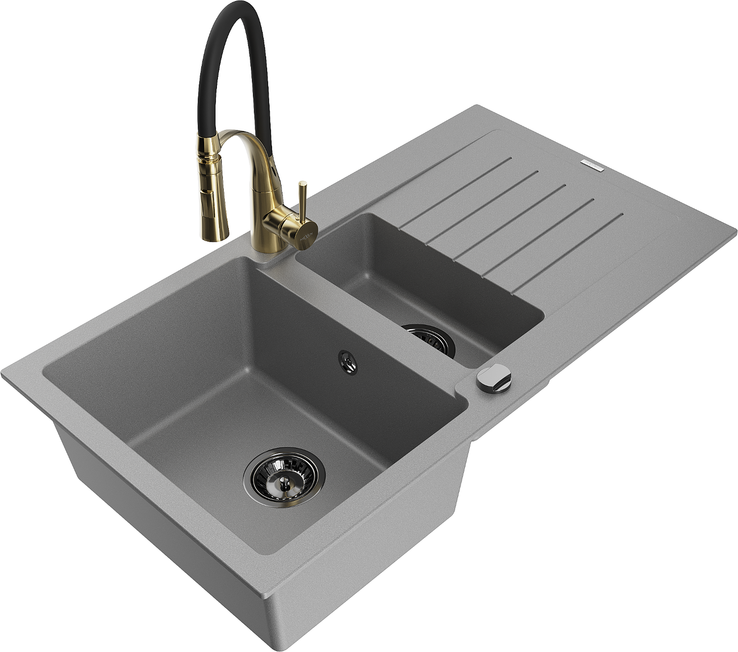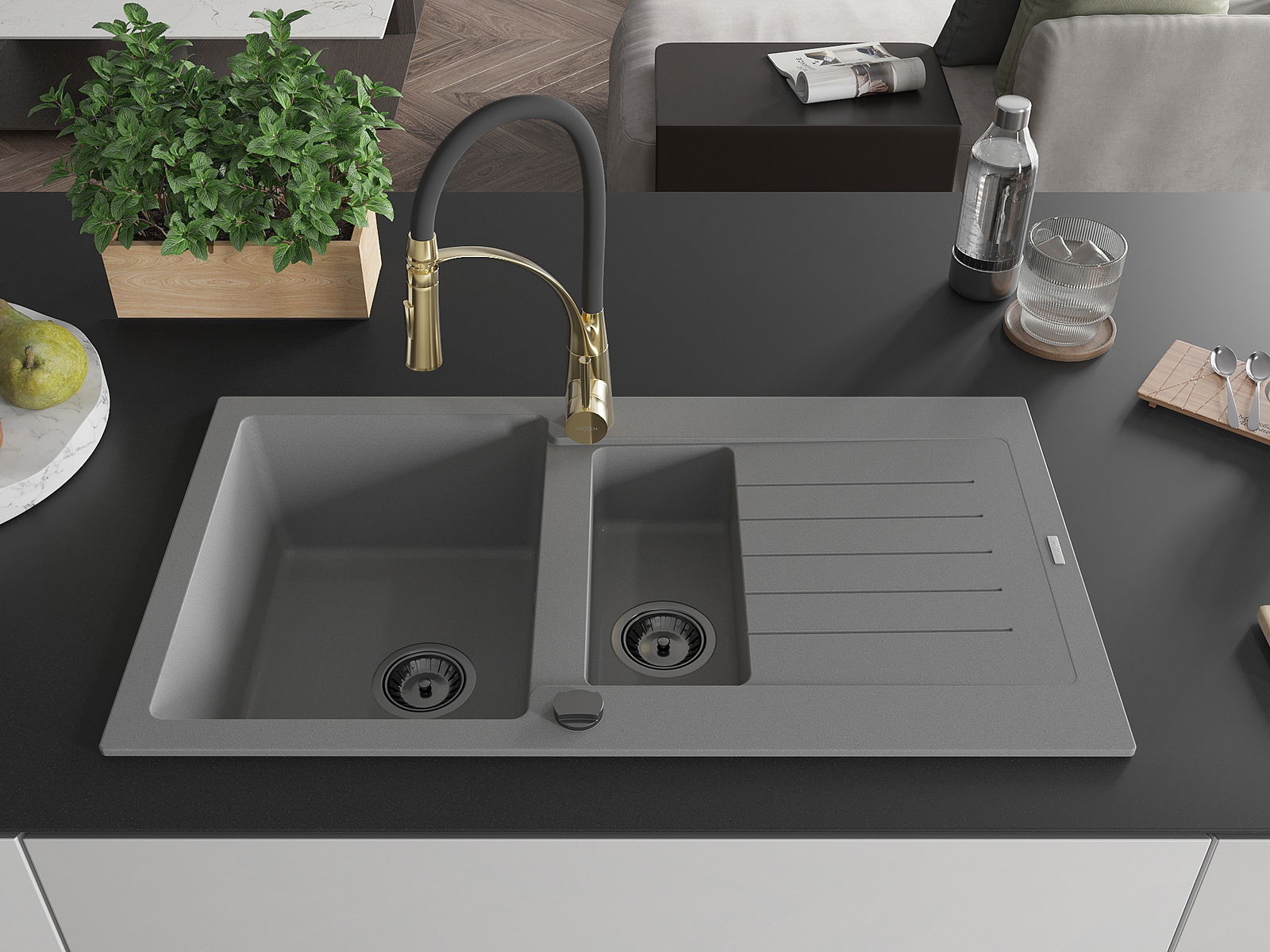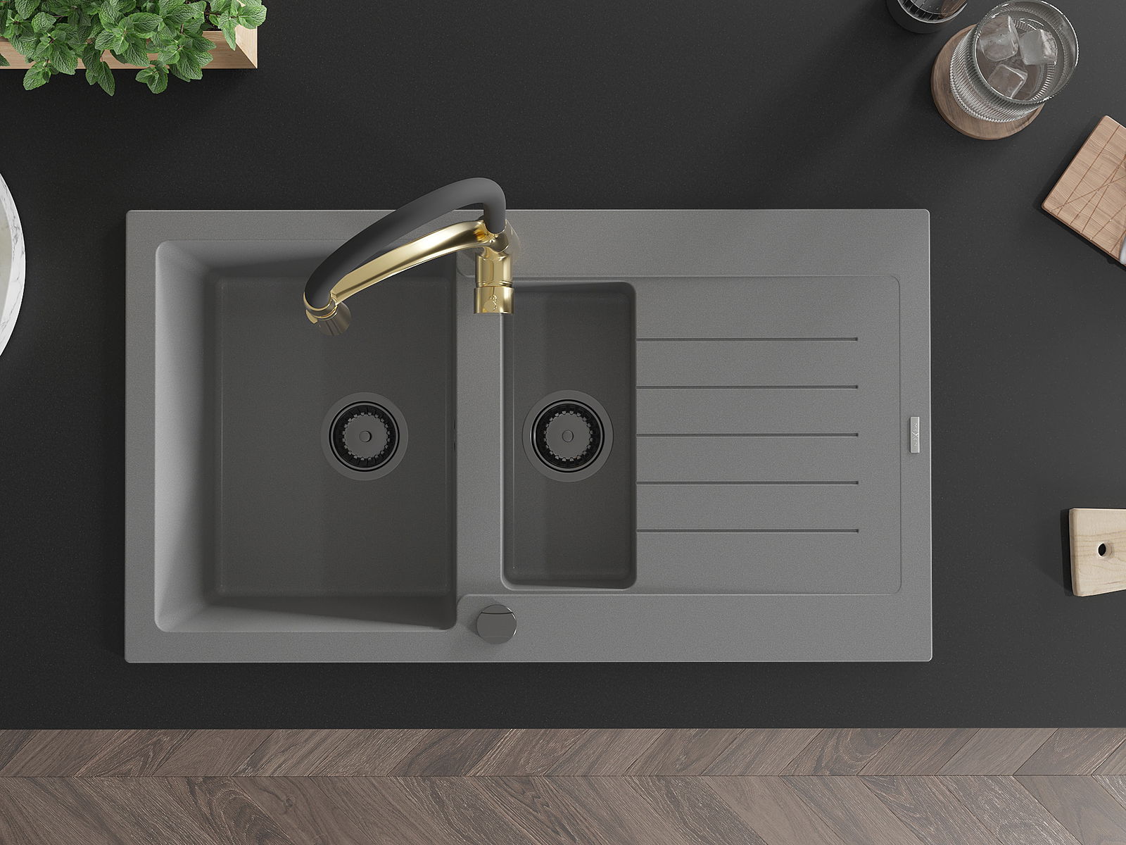 Mexen Matias Granitinė 1,5 sekcijų kriauklė su nutekėjimu ir virtuviniu maišytuvu „Aster“, pilka - 6502-71-73450-57-B