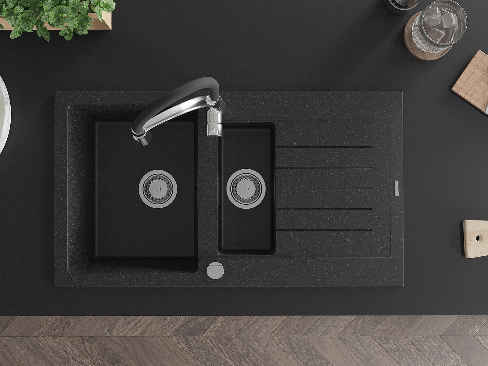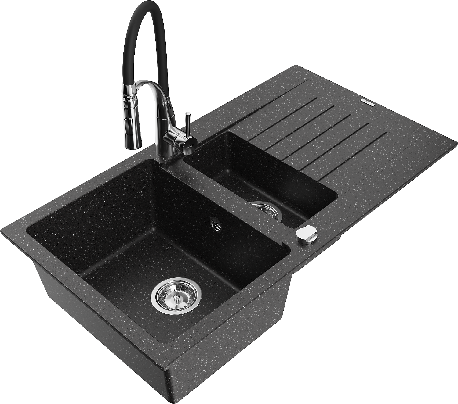 Mexen Matias 1,5 kamaros granito kriauklė su nusausintuvu ir virtuviniu maišytuvu Aster, juodas/sidabrinis metalikas
