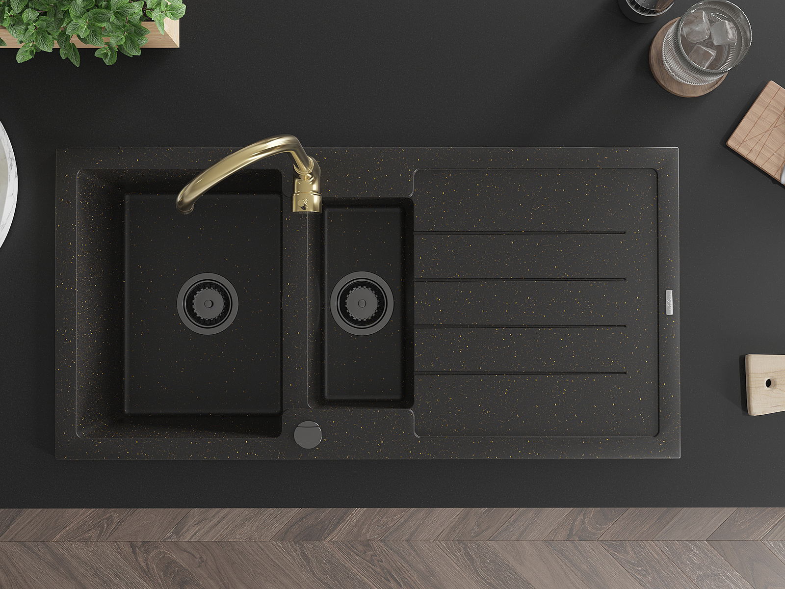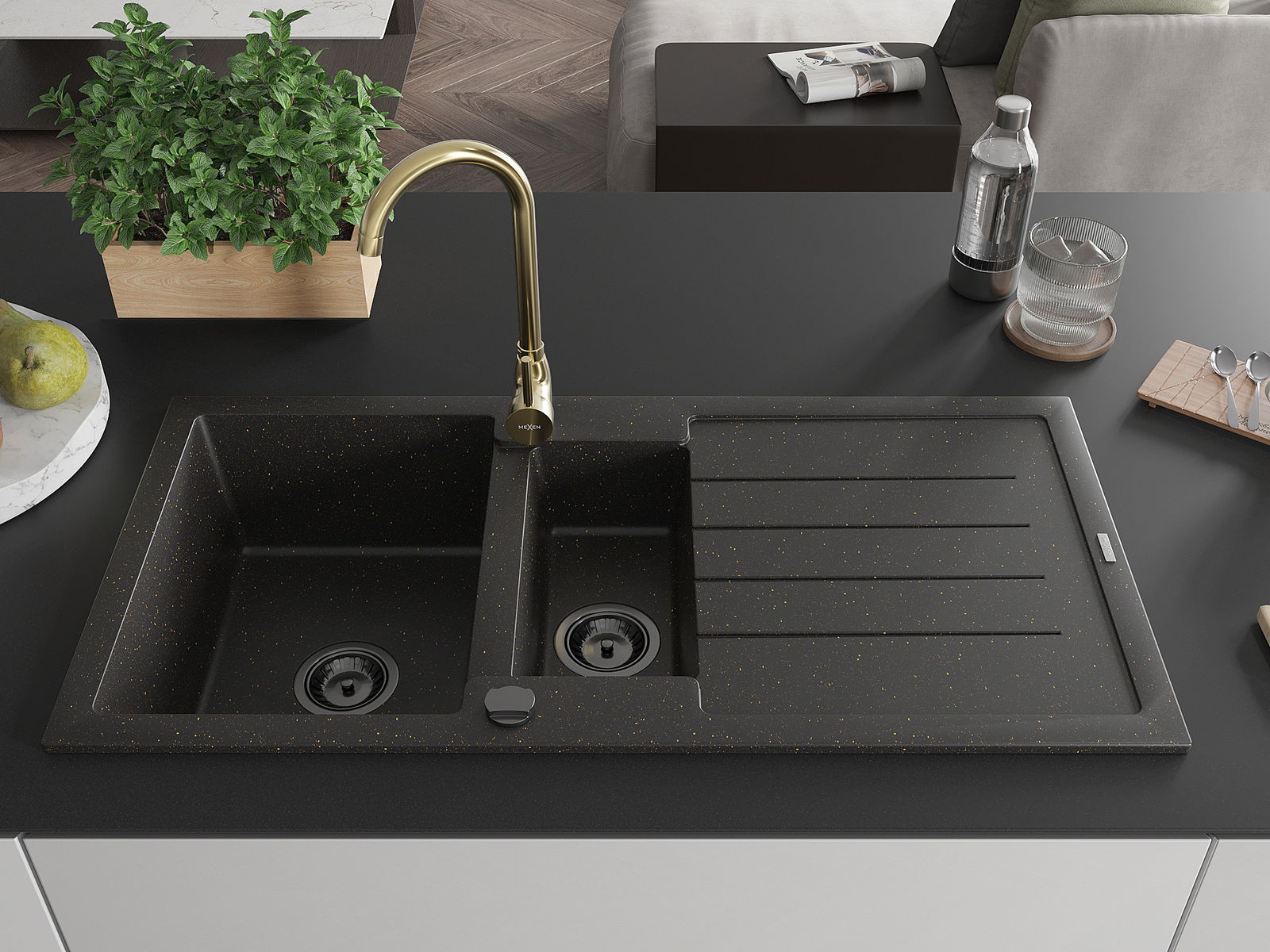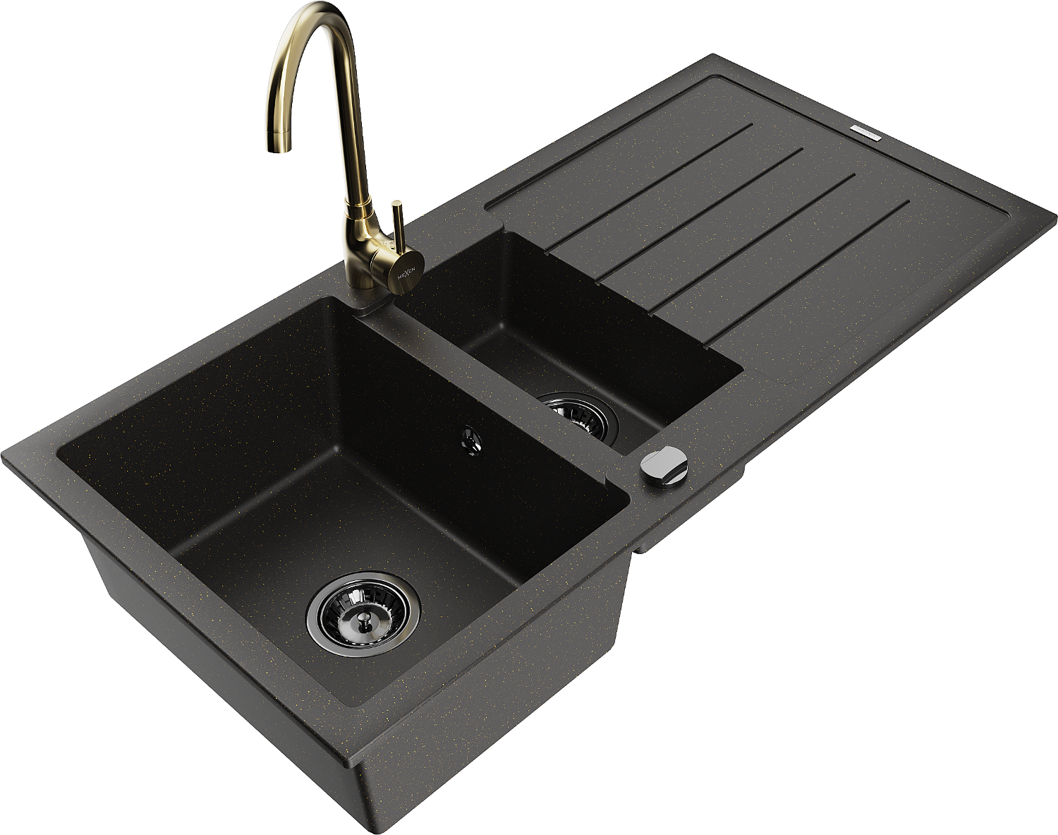 Mexen Andres granito kriauklė 1,5 kameros su nusausintuvu ir virtuvės maišytuvu Telma, juoda/aukso - 6515-75-670200-50-B
