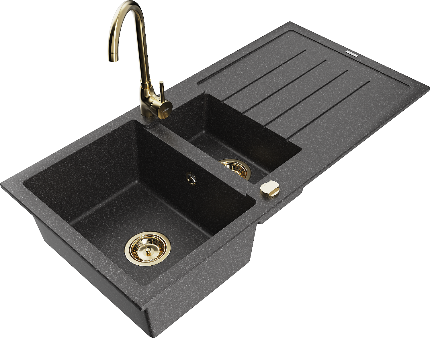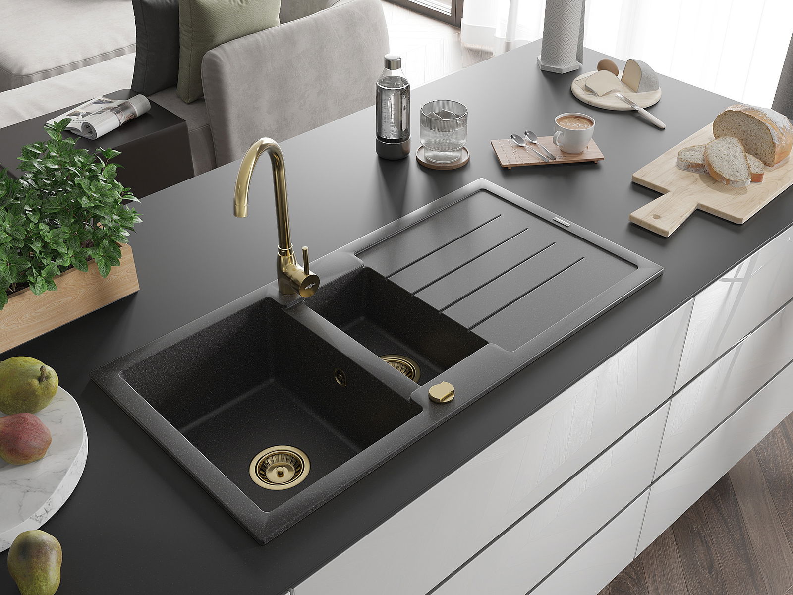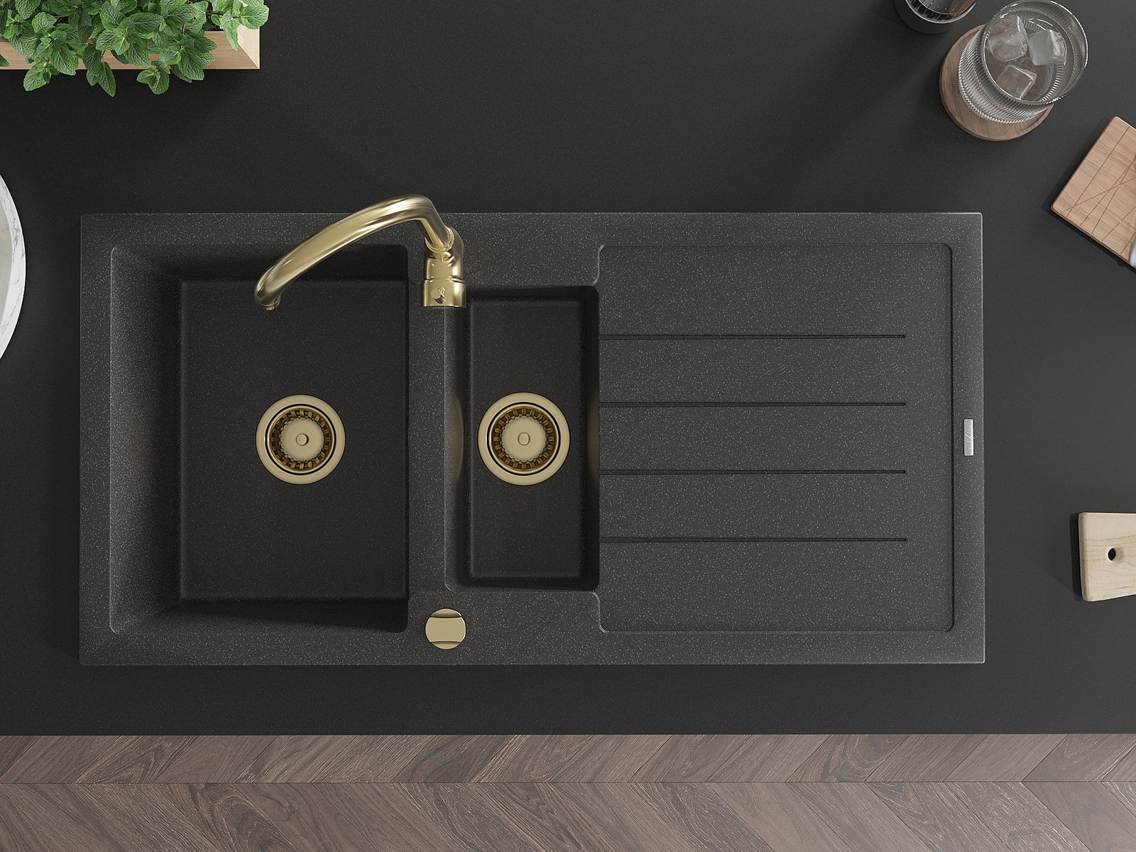 Mexen Andres granitinė 1,5 sekcijų plautuvė su nusausintuvu ir virtuviniu čiaupu Telma, juoda su dėmėmis