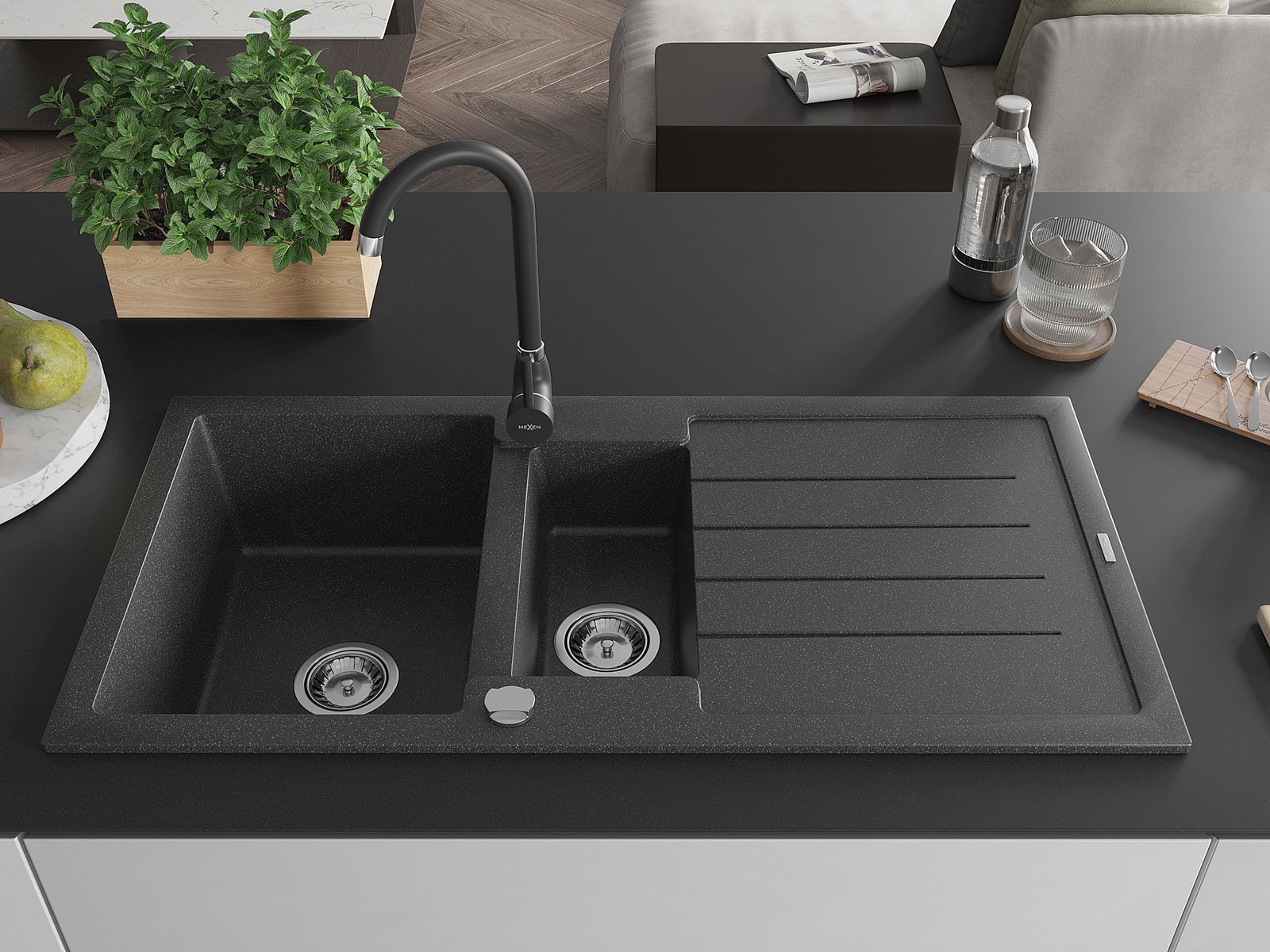 Mexen Andres granitinis 1,5 dubens plautuvas su lašintuvu ir virtuvės maišytuvu Telma, juodas dėmėtas - 6515-76-670200-70