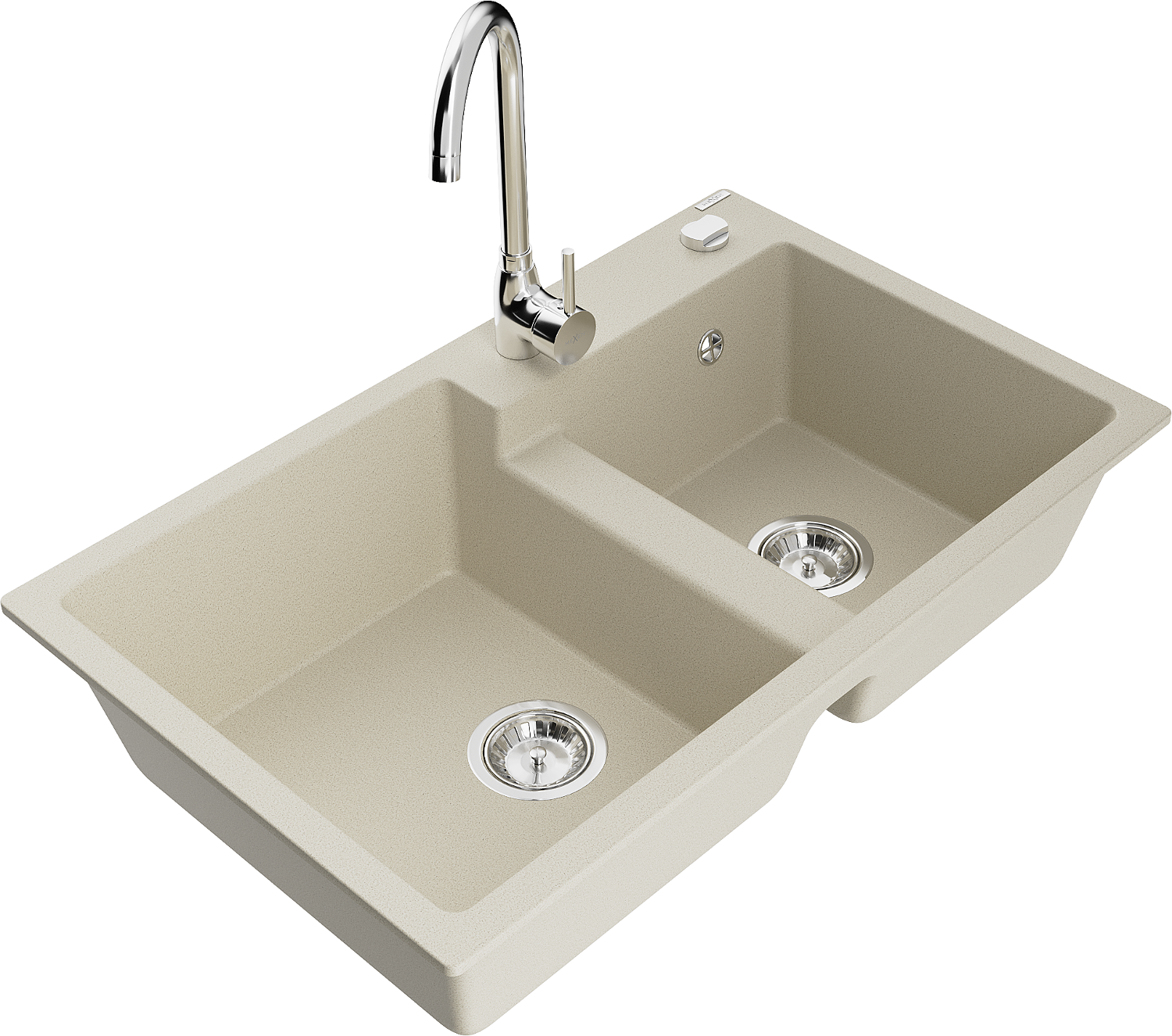 Mexen Tomas granitinis 2-jų kamerų plautuvas su virtuvės maišytuvu Telma, smėlio - 6516-69-670200-00