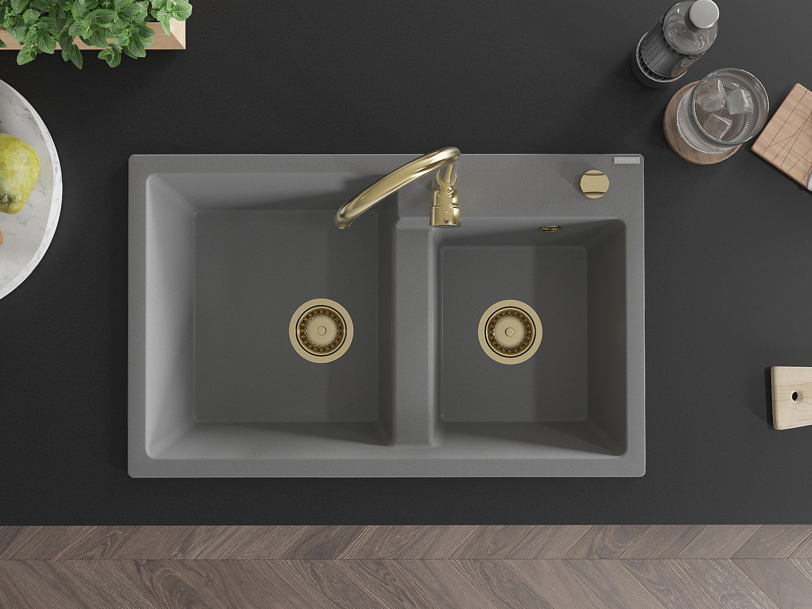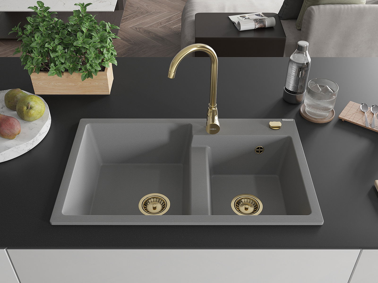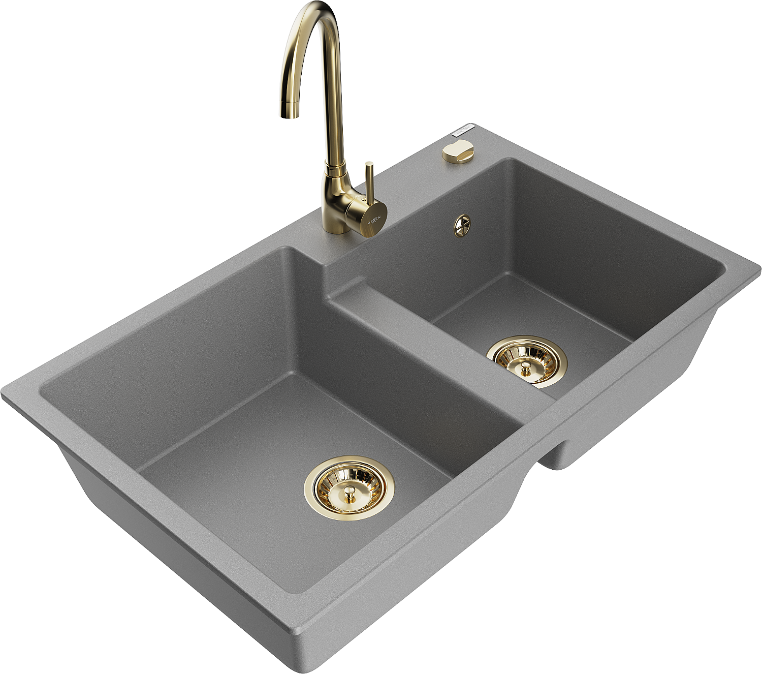 Mexen Tomas granito plautuvė su dviem kameromis ir virtuviniu maišytuvu Telma, pilka - 6516-71-670200-50