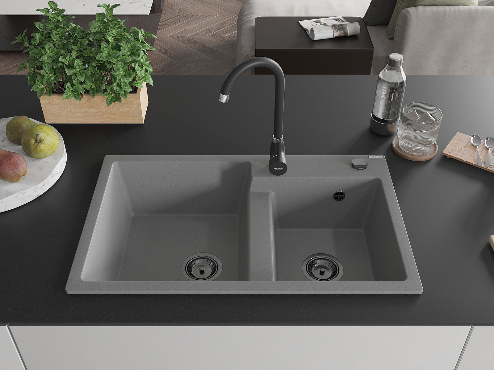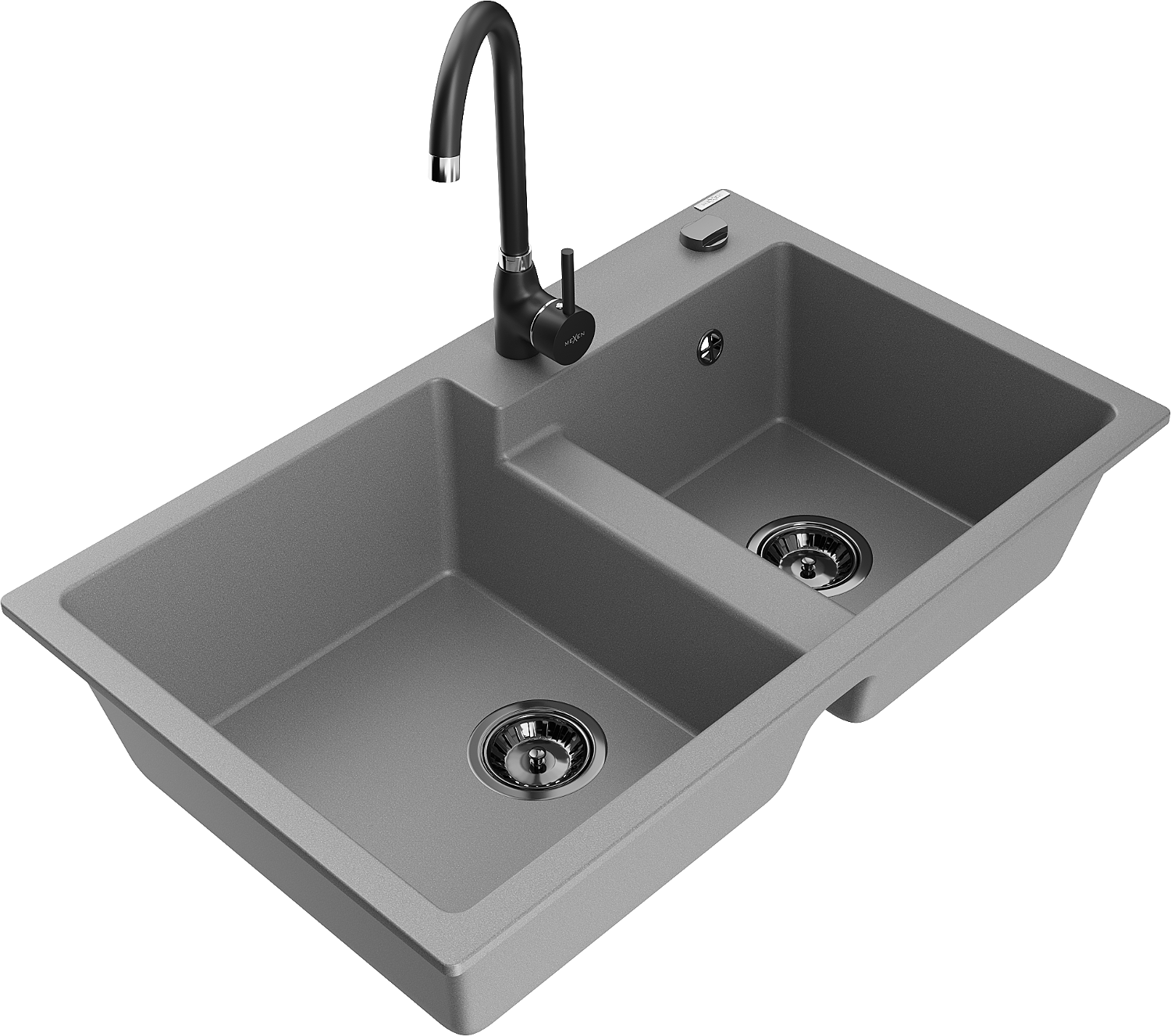 Mexen Tomas granitinis dviejų skyrių virtuvės plautuvė su maišytuvu Telma, pilka - 6516-71-670200-70-B