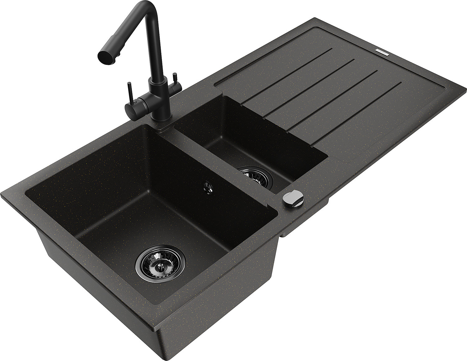 Mexen Andres granitinė 1,5 skyrių plautuvė su nusausintuvu ir virtuvės maišytuvu Duero, juoda/aukso - 6515-75-671600-70-B