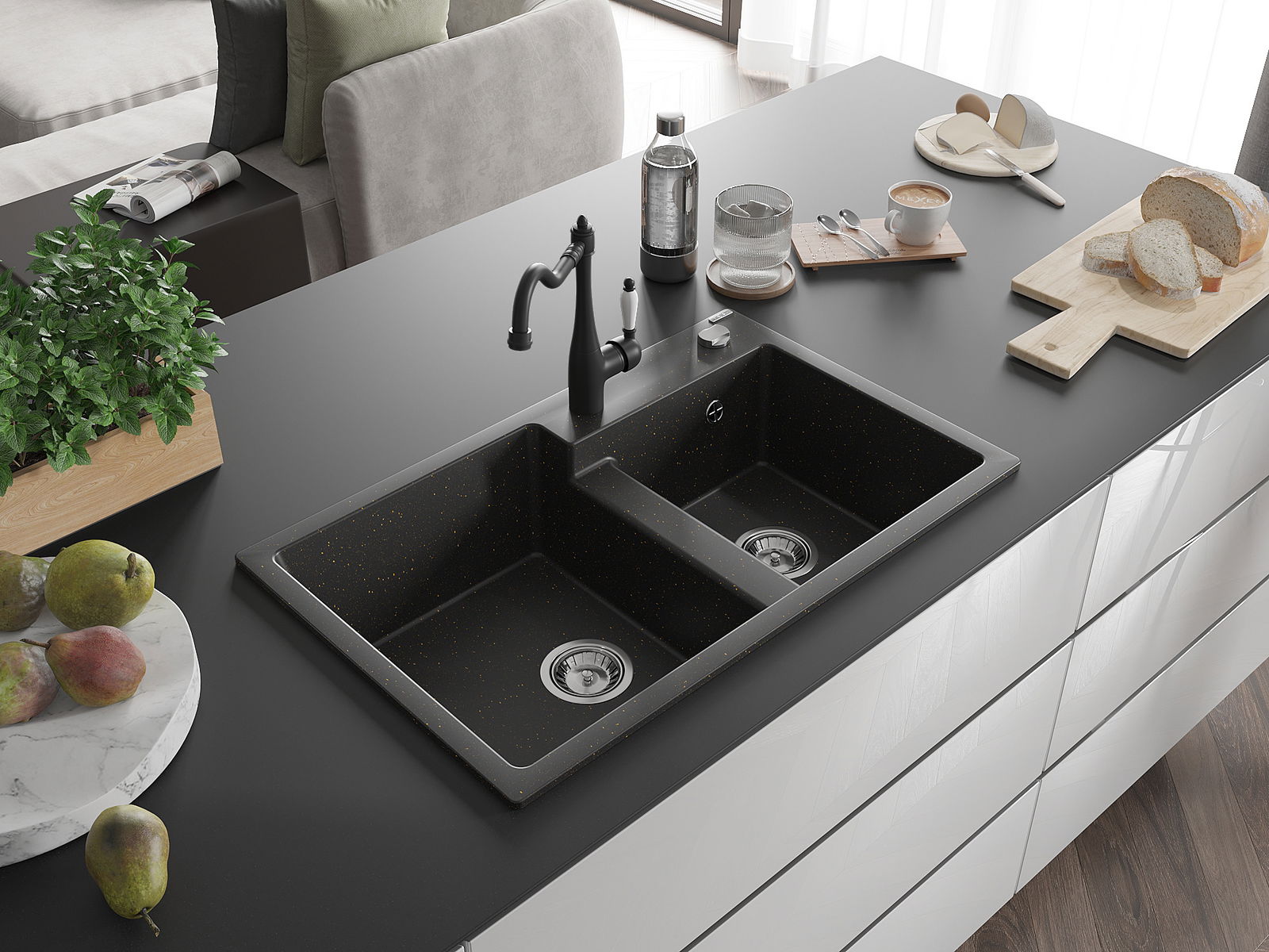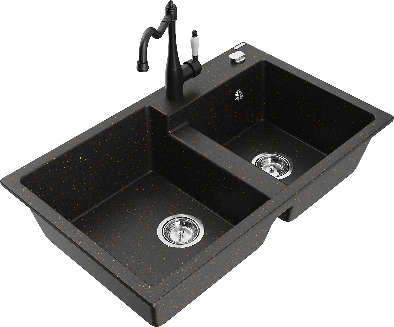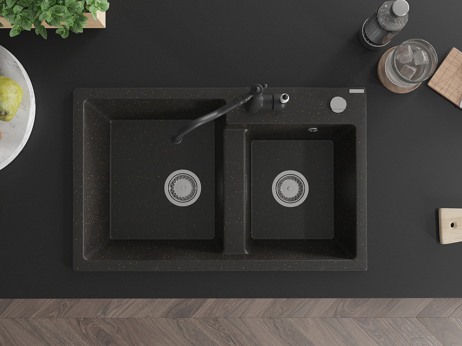 Mexen Tomas granitinė dviejų skylių kriauklė su virtuviniu maišytuvu Carla juodas/auksinis metalikas - 6516-75-670700-70