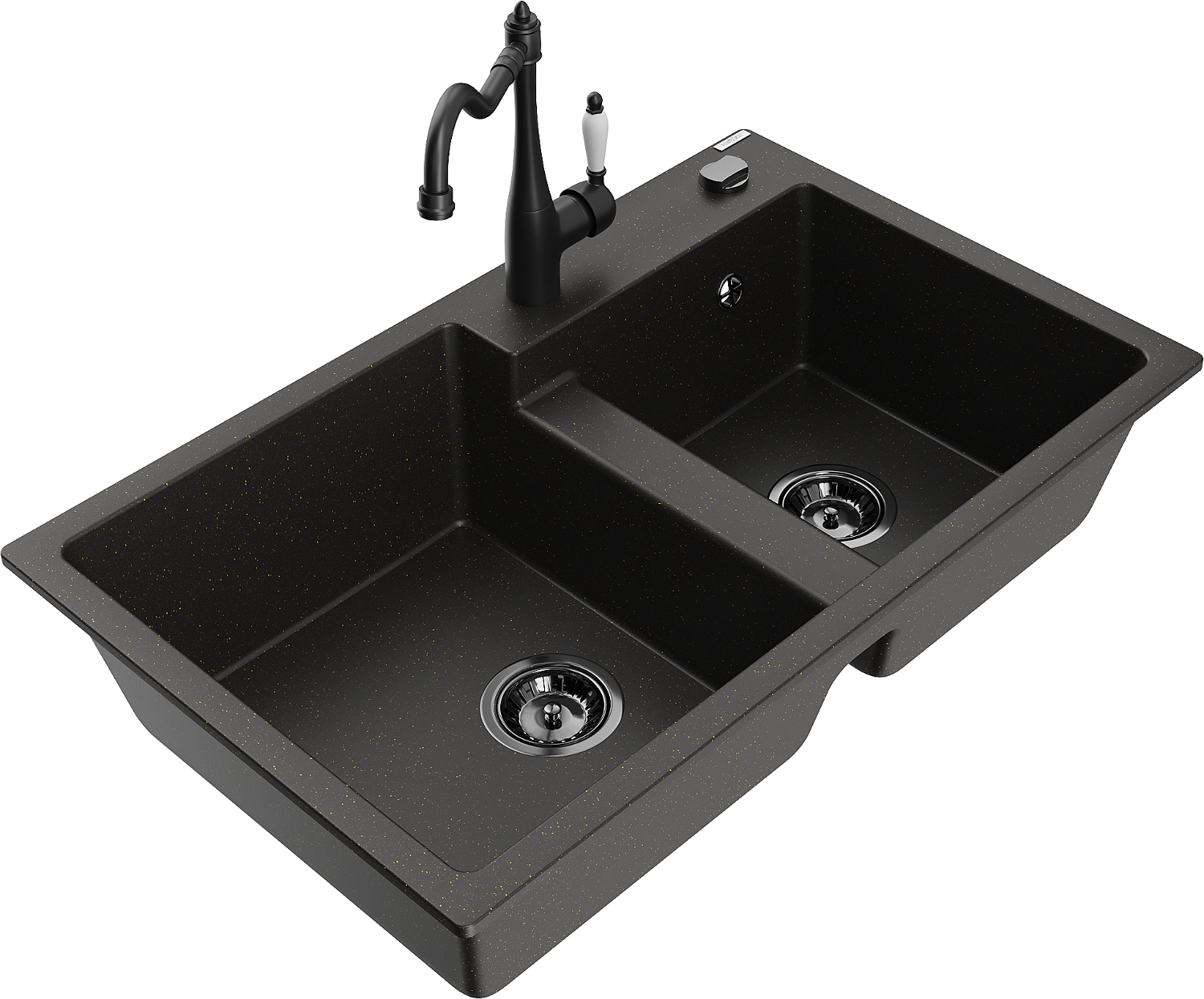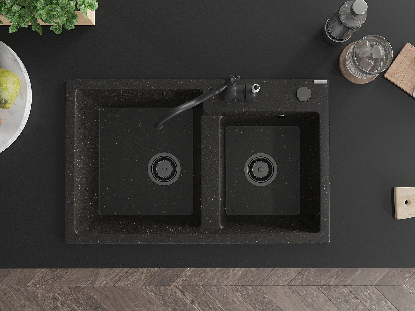 Mexen Tomas granitinė dviejų skyrių virtuvinė kriauklė su virtuviniu maišytuvu Carla, juoda/auksinė metalo