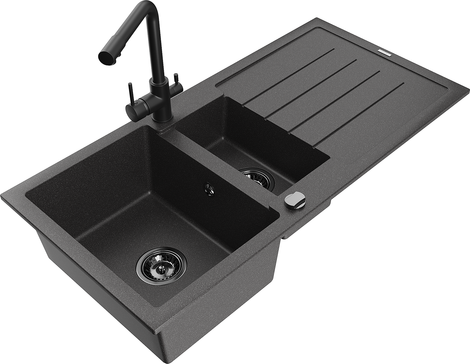 Mexen Andres granitinė 1,5 kamerų plautuvė su nutekėjimu ir virtuviniu maišytuvu Duero, juodas dėmėtasis - 6515-76-671600-70-B