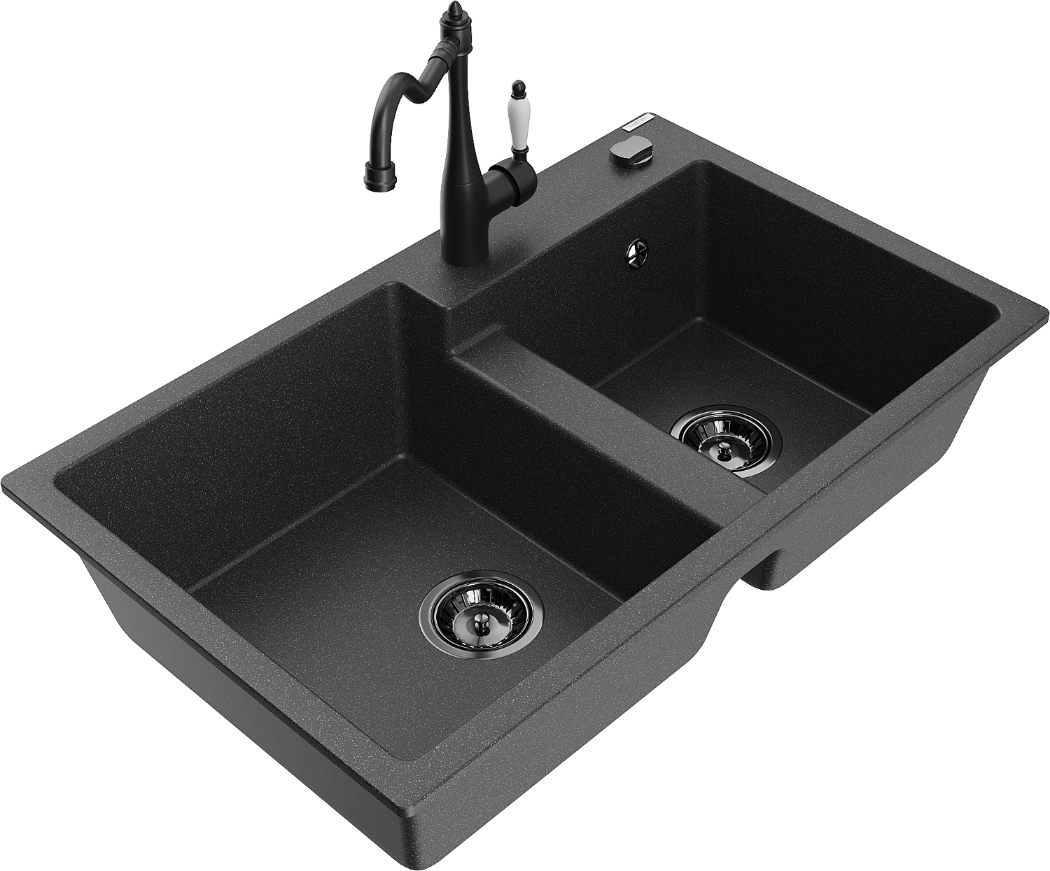 Mexen Tomas dviejų kamerų virtuvės granitinis praustuvas su virtuvės maišytuvu Carla, juodas dėmėtas - 6516-76-670700-70-B