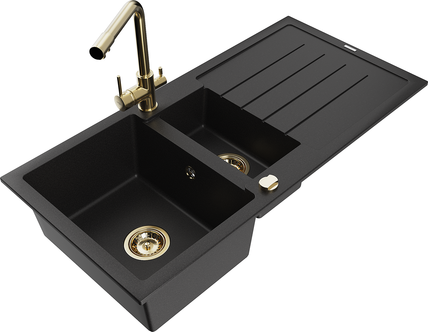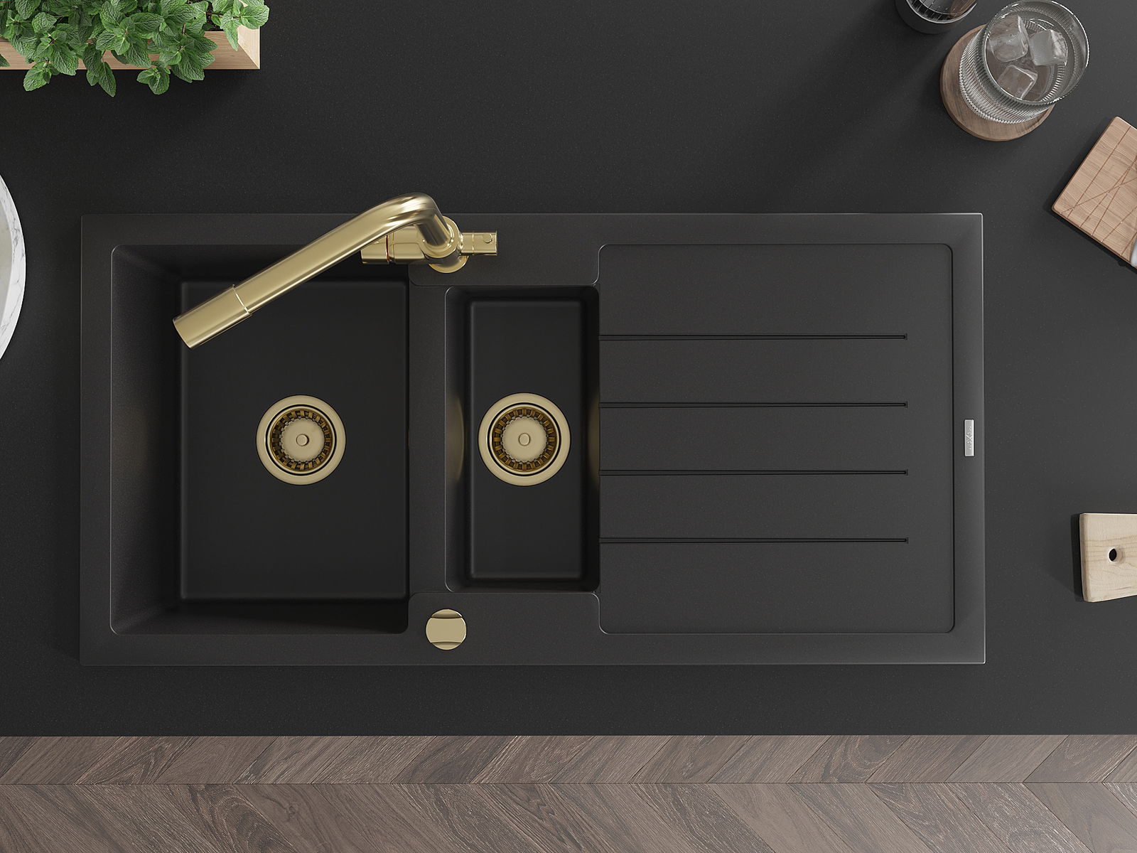 Mexen Andres granitinis plautuvės 1,5 kameros su nutekėjimu ir virtuviniu maišytuvu Duero, juodas - 6515-77-671600-50