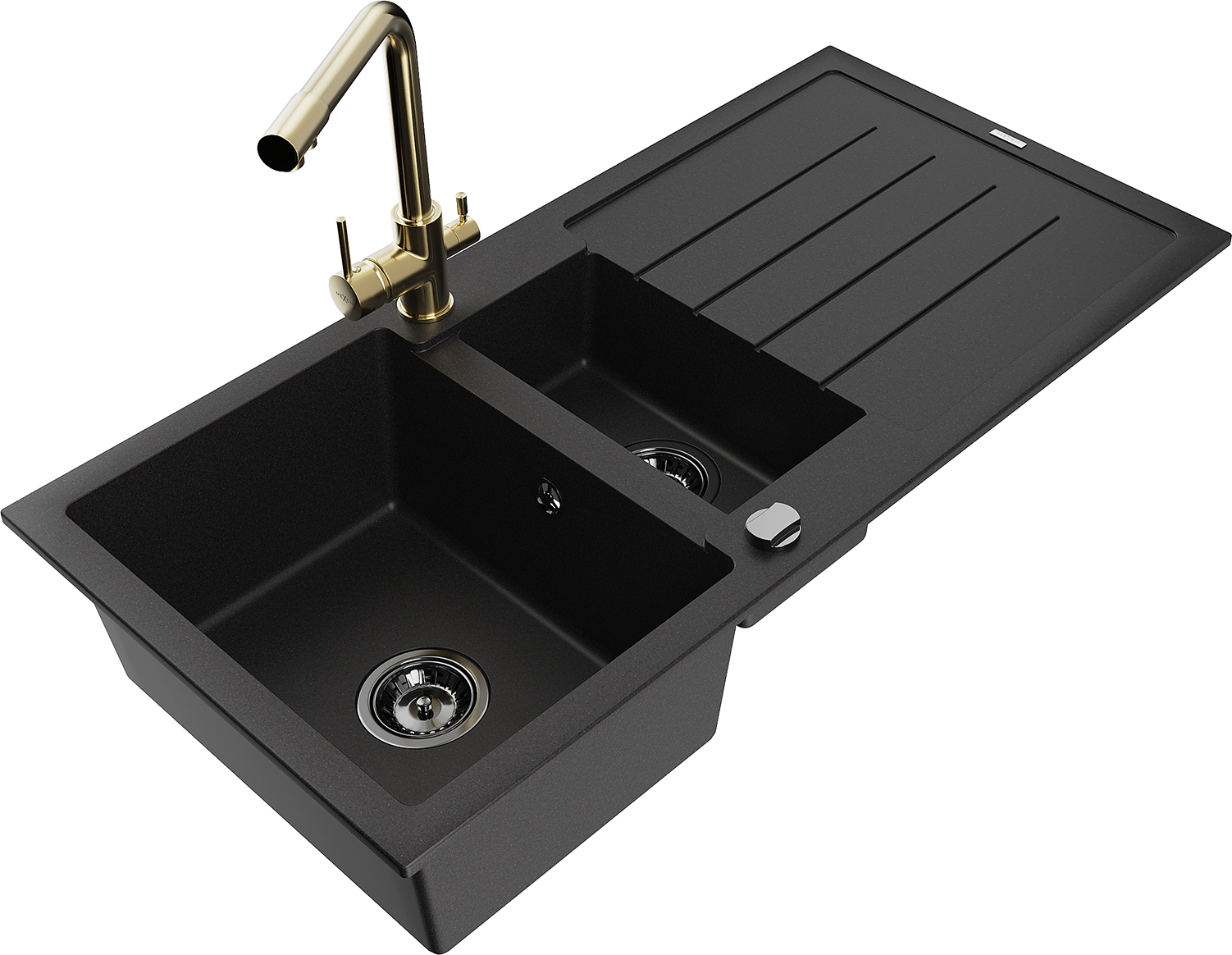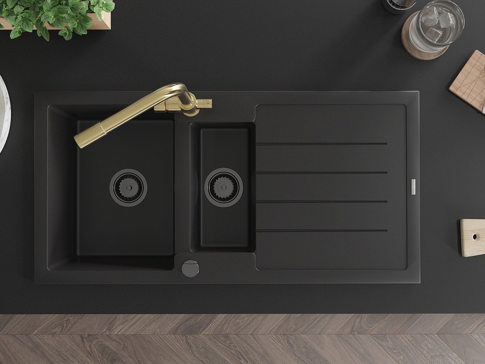 Mexen Andres granito plautuvė 1,5 kamerų su lašinimo lentyna ir virtuvės maišytuvu Duero, juodas - 6515-77-671600-50-B