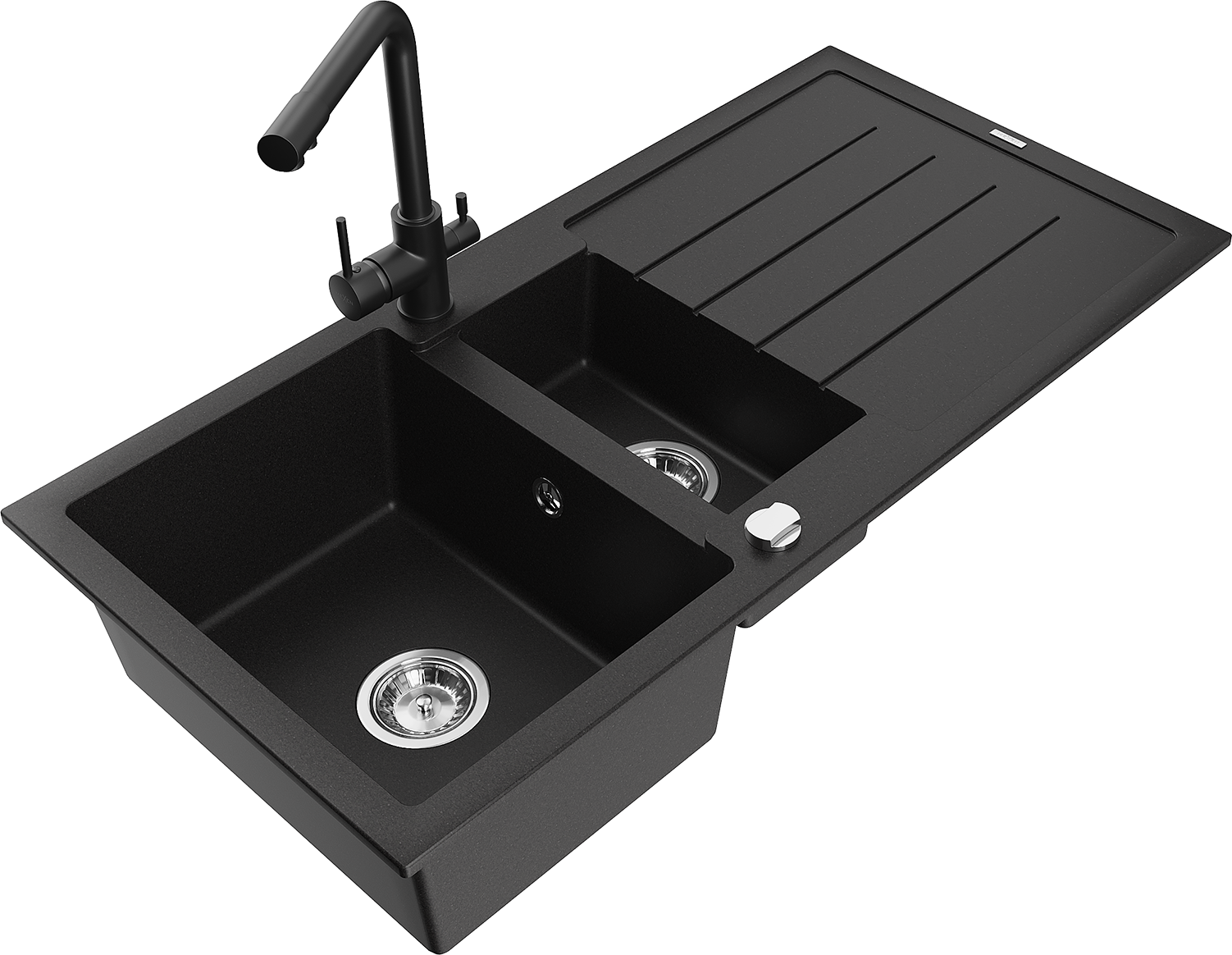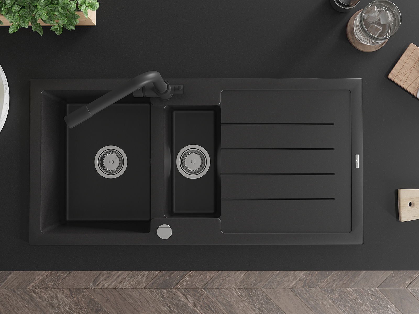 Mexen Andres granitinė plautuvė 1,5 skylių su nuotėkiu ir virtuviniu maišytuvu Duero, juoda - 6515-77-671600-70