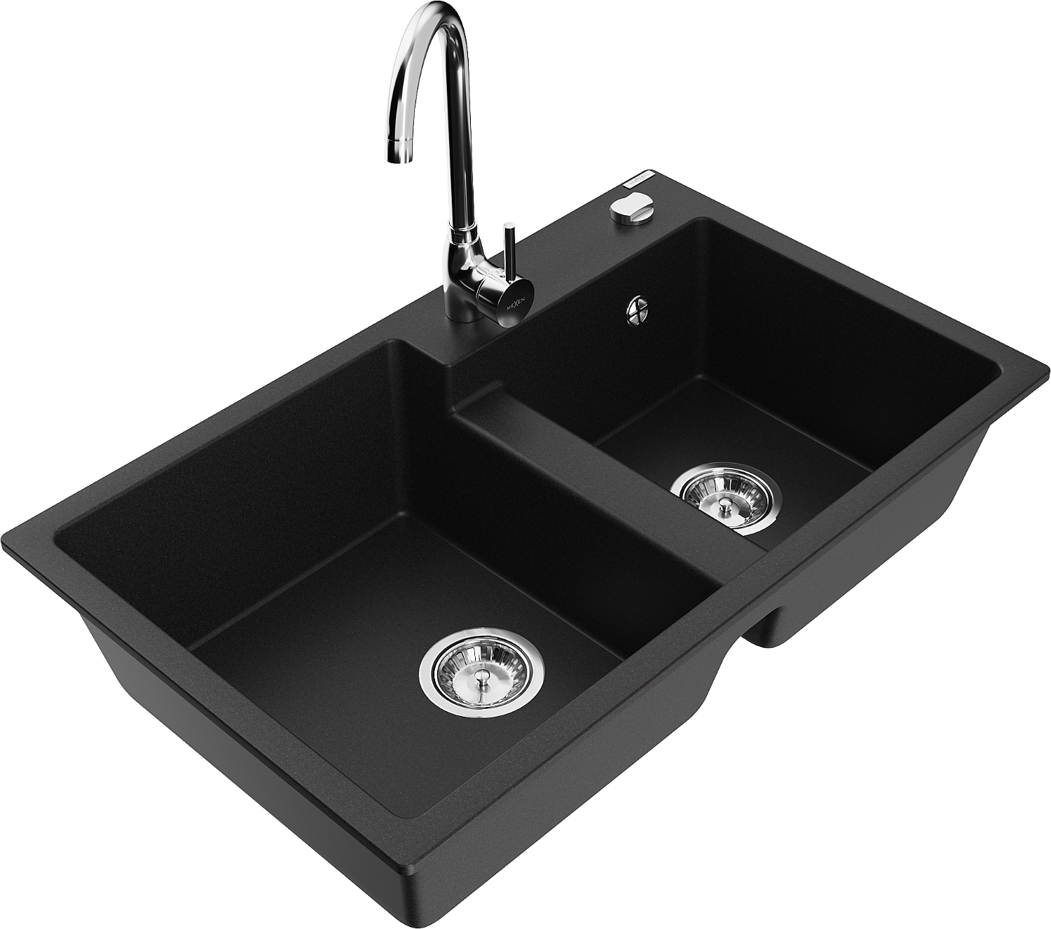 Mexen Tomas granito kriauklė su 2 kameromis ir virtuviniu maišytuvu Telma, juoda - 6516-77-670200-00