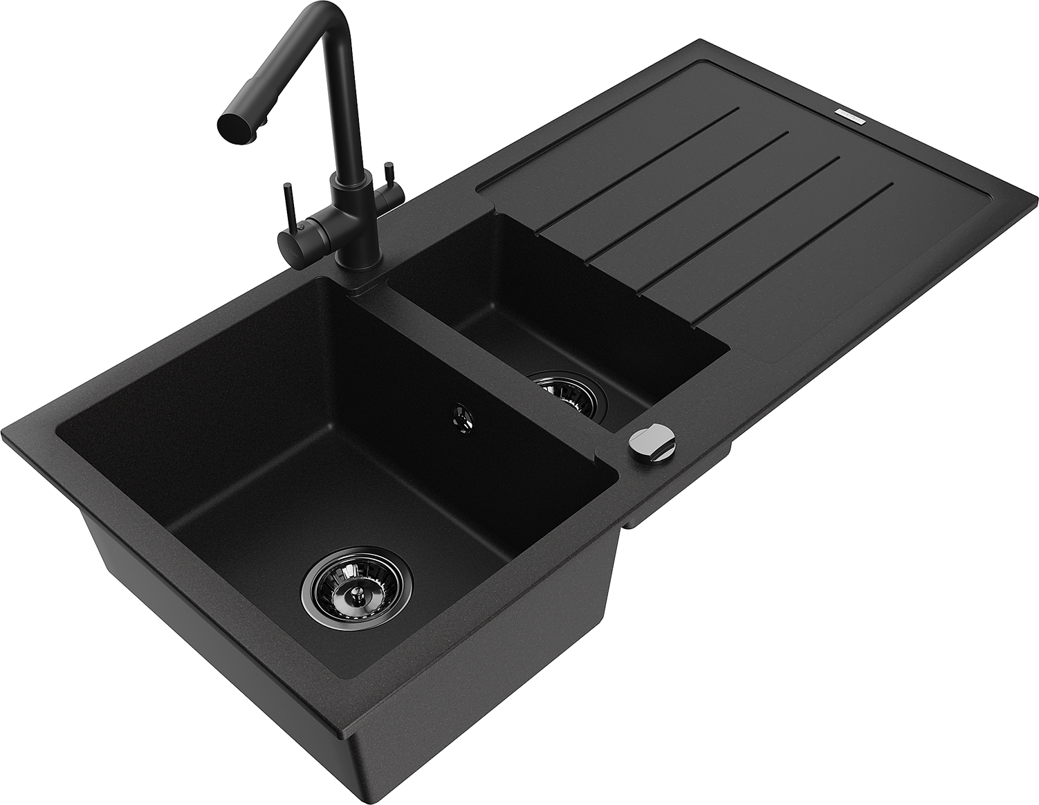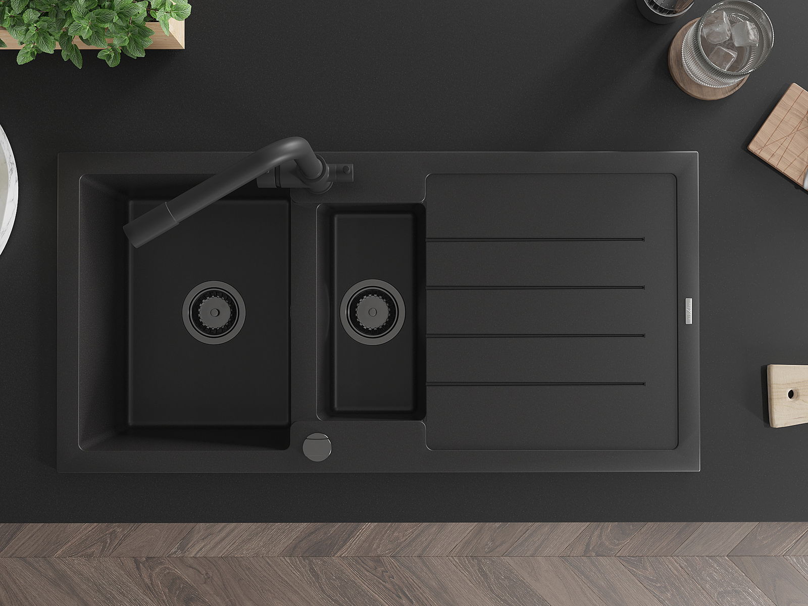 Mexen Andres granitinis plautuvės 1,5-skylių su nutekėjimu ir virtuviniu maišytuvu Duero, juodas - 6515-77-671600-70-B